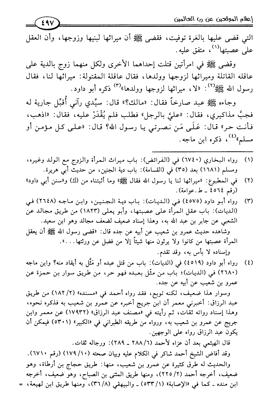 (٣) رواه أبو داود (٤٥٧٥) في (الديات): باب دية الجنين، وابن ماجه (٢٦٤٨) في (الديات): باب عقل المرأة على عصبتها، وأبو يعلى (١٨٢٣) من طريق مجالد عن الشعبي عن جابر بن عبد اللَّه به، وهذا إسناد ضعيف لضعف مجالد وهو ابن سعيد.
