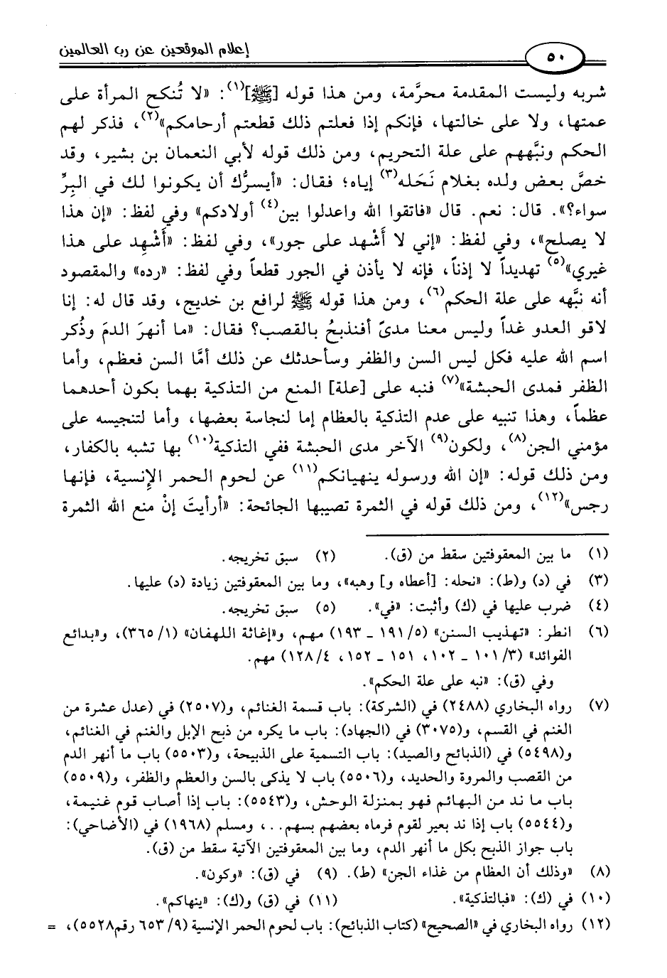 شربه وليست المقدمة محرَّمة، ومن هذا قوله [-صلى اللَّه عليه وسلم] (١): "لا تُنكح المرأة على عمتها، ولا على خالتها، فإنكم إذا فعلتم ذلك قطعتم أرحامكم" (٢)، فذكر لهم الحكم ونبَّههم على علة التحريم، ومن ذلك قوله لأبي النعمان بن بشير، وقد خصَّ بعض ولده بغلام نَحَله (٣) إياه؛ فقال: "أيسرُّك أن يكونوا لك في البِرِّ سواء؟ ". قال: نعم. قال "فاتقوا اللَّه واعدالوا بين (٤) أولادكم" وفي لفظ: "إن هذا لا يصلح"، وفي لفظ: "إني لا أَشْهد على جور"، وفي لفظ: "أَشْهِد على هذا غيري" (٥) تهديدًا لا إذنًا، فإنه لا يأذن في الجور قطعًا وفي لفظ: "رده" والمقصود أنه نبَّهه على علة الحكم (٦)، ومن هذا قوله -صلى اللَّه عليه وسلم- لرافع بن خديج، وقد قال له: إنا لاقو العدو غدًا وليس معنا مدًى أفنذبحُ بالقصب؟ فقال: "ما أنهرَ الدمَ وذُكر اسم اللَّه عليه فكل ليس السن والظفر وسأحدثك عن ذلك أمَّا السن فعظم، وأما الظفر فمدى الحبشة" (٧) فنبه على أعلة، المنع من التذكية بهما بكون أحدهما عظمًا، وهذا تنبيه على عدم التذكية بالعظام إما لنجاسة بعضها، وأما لتنجيسه على مؤمني الجن (٨)، ولكون (٩) الآخر مدى الحبشة ففي التذكية (١٠) بها تشبه بالكفار، ومن ذلك قوله: "إن اللَّه ورسوله ينهيانكم (١١) عن لحوم الحمر الإِنسية، فإنها رجس" (١٢)، ومن ذلك قوله في الثمرة تصيبها الجائحة: "أرأيتَ إنْ منع اللَّه الثمرة