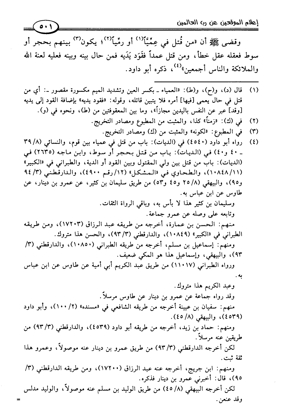 (٤) رواه أبو داود (٤٥٤٠) في (الديات): باب من قتل في عمياء بين قوم، والنسائي (٨/ ٣٩ - ٤٠ و ٤٠) في (الديات): باب من قتل بحجر أو سوط، وابن ماجه (٢٦٣٥) في (الديات): باب من قتل بين ولي المقتول وبين القود أو الدية، والطبراني في "الكبير" (١١/ ١٠٨٤٨)، والطحاوي في "المشكل" (١٢/ رقم ٤٩٠٠)، والدارقطني (٣/ ٩٤ و ٩٥)، والبيهقي (٨/ ٢٥ و ٤٥ و ٥٣) من طريق سليمان بن كثير، عن عمرو بن دينار، عن طاوس عن ابن عباس به.