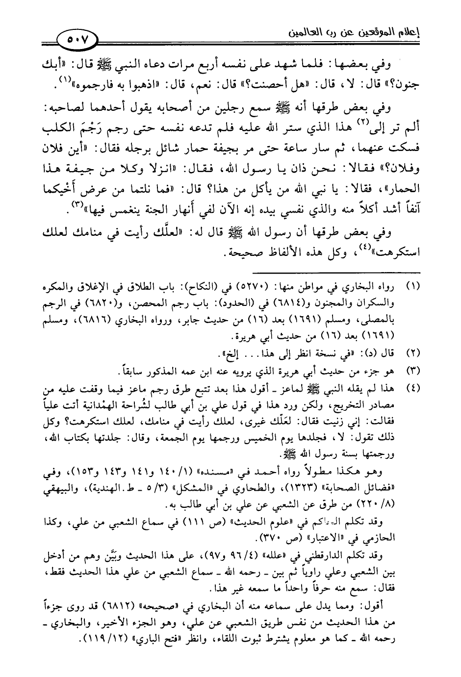 (٤) هذا لم يقله النبي -صلى اللَّه عليه وسلم- لماعز -أقول هذا بعد تتبع طرق رجم ماعز فيما وقفت عليه من مصادر التخريج، ولكن ورد هذا في قول علي بن أبي طالب لشُراحة الهمْدانية أتت عليًا فقالت: إني زنيت فقال: لعَفك غيرى، لعلك رأيت في منامك، لعلك استكرهت؟ وكل ذلك تقول: لا، فجلدها يوم الخميس ورجمها يوم الجمعة، وقال: جلدتها بكتاب اللَّه، ورجمتها بسنة رسول اللَّه -صلى اللَّه عليه وسلم-.