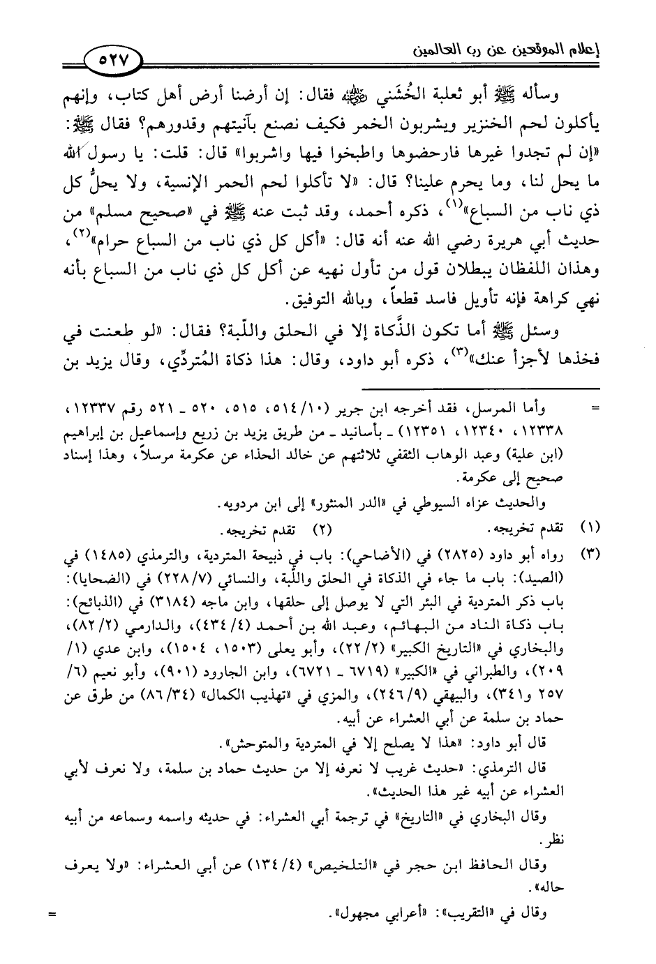 وسأله -صلى اللَّه عليه وسلم- أبو ثعلبة الخُشَني -رضي اللَّه عنه- فقال: إن أرضنا أرض أهل كتاب، وإنهم يأكلون لحم الخنزير ويشربون الخمر فكيف نصنع بآنيتهم وقدورهم؟ فقال -صلى اللَّه عليه وسلم-: "إن لم تجدوا غيرها فارحضوها واطبخوا فيها واشربوا" قال: قلت: يا رسول اللَّه ما يحل لنا، وما يحرم علينا؟ قال: "لا تأكلوا لحم الحمر الإنسية، ولا يحلُّ كل ذي ناب من السباع" (١)، ذكره أحمد، وقد ثبت عنه -صلى اللَّه عليه وسلم- في "صحيح مسلم" من حديث أبي هريرة رضي اللَّه عنه أنه قال: "أكل كل ذي ناب من السباع حرام" (٢)، وهذان اللفظان يبطلان قول من تأول نهيه عن أكل كل ذي ناب من السباع بأنه نهي كراهة فإنه تأويل فاسد قطعًا، وباللَّه التوفيق.