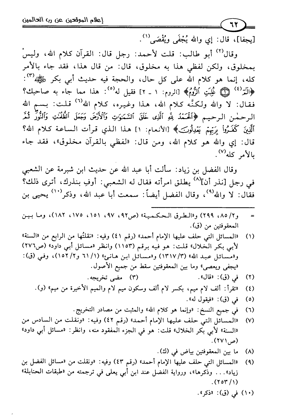 وقال (٢) أبو طالب: قلت لأحمد: رجل قال: القرآن كلام اللَّه، وليس بمخلوق، ولكن لفظي هذا به مخلوق، قال: من قال هذا، فقد جاء بالأمر كله، إنما هو كلام اللَّه على كل حال، والحجة فيه حديث أبي بكر -رضي اللَّه عنه- (٣): {الم (٤) (١) غُلِبَتِ الرُّومُ} [الروم: ١ - ٢] فقيل له (٥): هذا مما جاء به صاحبك؟ فقال: لا واللَّه ولكنَّه كلام اللَّه، هذا وغيره، كلام اللَّه (٦) قلت: بِسْمِ اللَّهِ الرَّحْمَنِ الرَّحِيمِ {الْحَمْدُ لِلَّهِ الَّذِي خَلَقَ السَّمَاوَاتِ وَالْأَرْضَ وَجَعَلَ الظُّلُمَاتِ وَالنُّورَ ثُمَّ الَّذِينَ كَفَرُوا بِرَبِّهِمْ يَعْدِلُونَ} [الأنعام: ١] هذا الذي قرأت الساعة كلام اللَّه؟ قال: إي واللَّه هو كلام اللَّه، ومن قال: "لفظي بالقرآن مخلوق"، فقد جاء بالأمر كله (٧).
