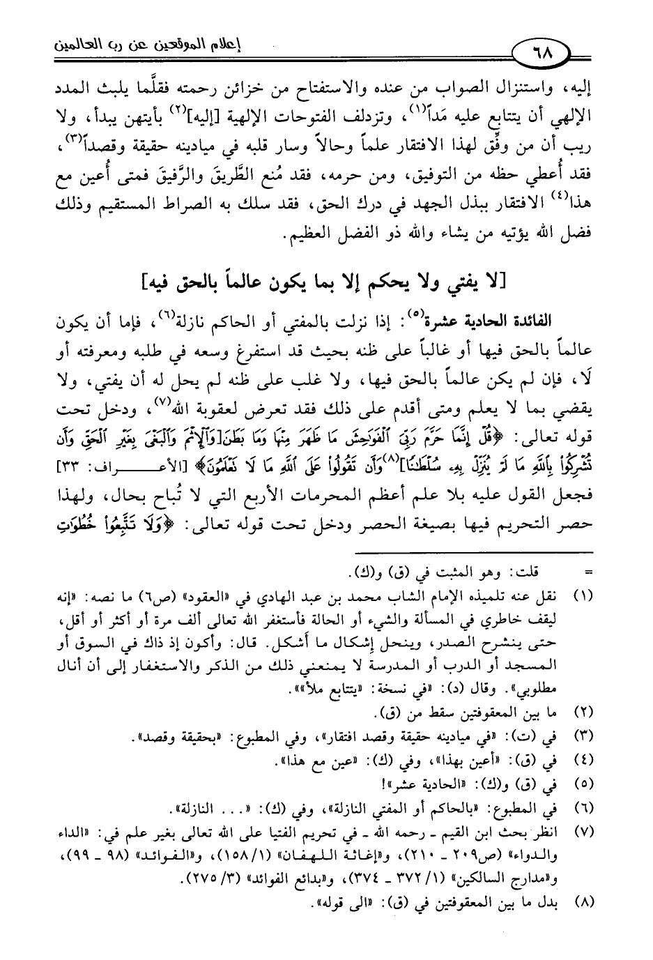 (٧) انظر بحث ابن القيم -رحمه اللَّه- في تحريم الفتيا على اللَّه تعالى بغير علم في: "الداء والدواء" (ص ٢٠٩ - ٢١٠)، و"إغاثة اللهفان" (١/ ١٥٨)، و"الفوائد" (٩٨ - ٩٩)، و"مدارج السالكين" (١/ ٣٧٢ - ٣٧٤)، و"بدائع الفوائد" (٣/ ٢٧٥).