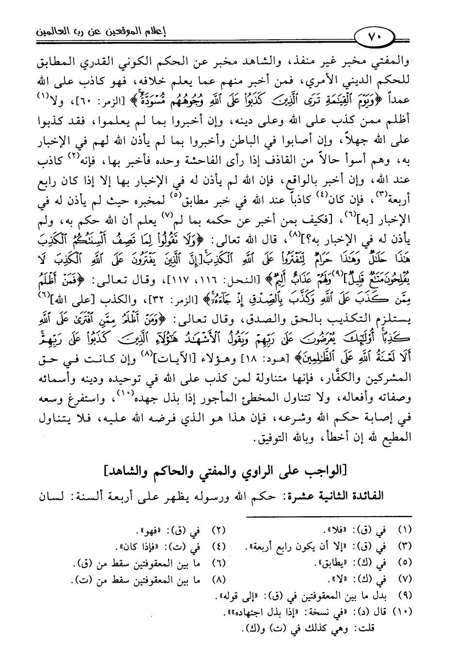 والمفتي مخبر غير منفذ، والشاهد مخبر عن الحكم الكوني القدري المطابق للحكم الديني الأمري، فمن أخبر منهم عما يعلم خلافه، فهو كاذب على اللَّه عمدًا {وَيَوْمَ الْقِيَامَةِ تَرَى الَّذِينَ كَذَبُوا عَلَى اللَّهِ وُجُوهُهُمْ مُسْوَدَّةٌ} [الزمر: ٦٠]، ولا (١) أظلم ممن كذب على اللَّه وعلى دينه، وإن أخبروا بما لم يعلموا، فقد كذبوا على اللَّه جهلًا، وإن أصابوا في الباطن وأخبروا بما لم يأذن اللَّه لهم في الإخبار به، وهم أسوأ حالًا من القاذف إذا رأى الفاحشة وحده فأخبر بها، فإنه (٢) كاذب عند اللَّه، وإن أخبر بالواقع، فإن اللَّه لم يأذن له في الإخبار بها إلا إذا كان رابع أربعة (٣)، فإن كان (٤) كاذبًا عند اللَّه في خبر مطابق (٥) لمخبره حيث لم يأذن له في الإخبار [به] (٦)، [كيف بمن أخبر عن حكمه بما لم (٧) يعلم أن اللَّه حكم به، ولم يأذن له في الإخبار به؟] (٨)، قال اللَّه تعالى: {وَلَا تَقُولُوا لِمَا تَصِفُ أَلْسِنَتُكُمُ الْكَذِبَ هَذَا حَلَالٌ وَهَذَا حَرَامٌ لِتَفْتَرُوا عَلَى اللَّهِ الْكَذِبَ [إِنَّ الَّذِينَ يَفْتَرُونَ عَلَى اللَّهِ الْكَذِبَ لَا يُفْلِحُونَ (١١٦) مَتَاعٌ قَلِيلٌ] (٩) وَلَهُمْ عَذَابٌ أَلِيمٌ} [النحل: ١١٦ - ١١٧]، وقال تعالى: {فَمَنْ أَظْلَمُ مِمَّنْ كَذَبَ عَلَى اللَّهِ وَكَذَّبَ بِالصِّدْقِ إِذْ جَاءَهُ} [الزمر: ٣٢]، والكذب [على اللَّه] (٦) يستلزم التكذيب بالحق والصدق، وقال تعالى: {وَمَنْ أَظْلَمُ مِمَّنِ افْتَرَى عَلَى اللَّهِ كَذِبًا أُولَئِكَ يُعْرَضُونَ عَلَى رَبِّهِمْ وَيَقُولُ الْأَشْهَادُ هَؤُلَاءِ الَّذِينَ كَذَبُوا عَلَى رَبِّهِمْ أَلَا لَعْنَةُ اللَّهِ عَلَى الظَّالِمِينَ} [هود: ١٨] وهؤلاء [الآيات] (٨) وإن كانت في حق المشركين والكفَّار، فإنها متناولة لمن كذب على اللَّه في توحيده ودينه وأسمائه وصفاته وأفعاله، ولا تتناول المخطئ المأجور إذا بذل جهده (١٠)، واستفرغ وسعه في إصابة حكم اللَّه وشرعه، فإن هذا هو الذي فرضه اللَّه عليه، فلا يتناول المطيع للَّه إن أخطأ، وباللَّه التوفيق.