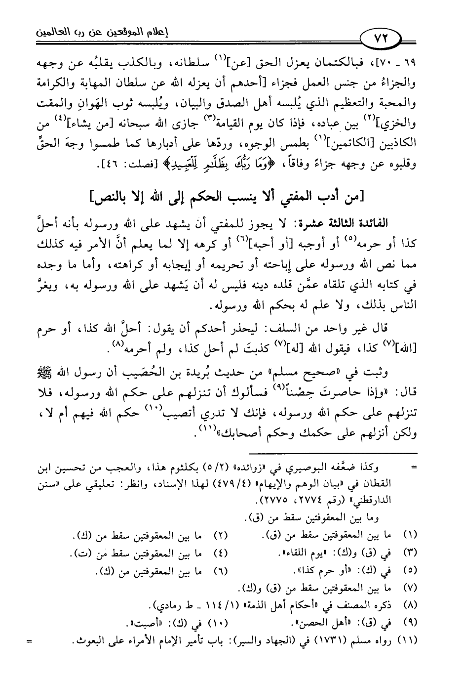 [من أدب المفتي ألا ينسب الحكم إلى اللَّه إلا بالنص]