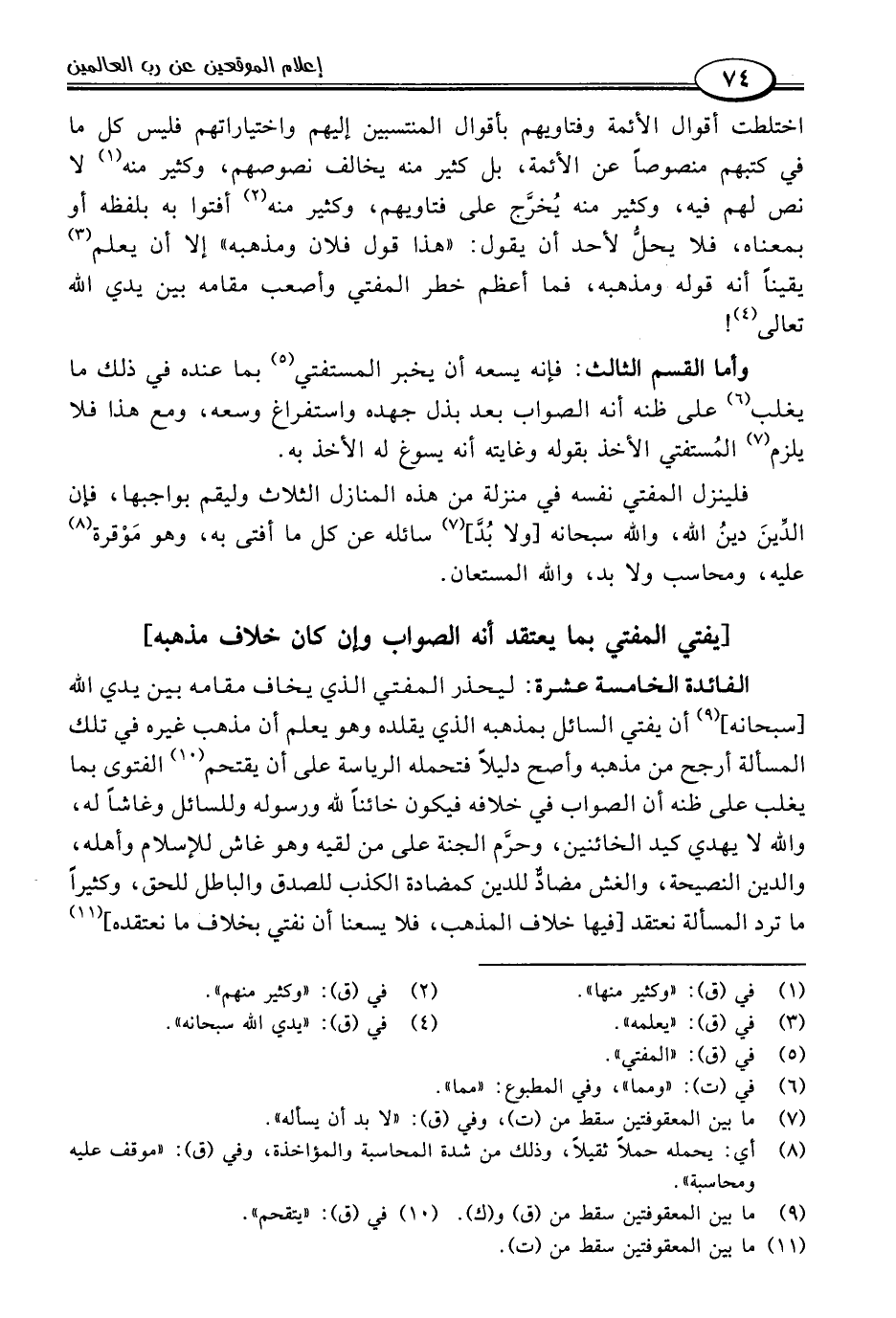 فلينزل المفتي نفسه في منزلة من هذه المنازل الثلاث وليقم بواجبها، فإن الدِّينَ دينُ اللَّه، واللَّه سبحانه [ولا بُدَّ] (٧) سائله عن كل ما أفتى به، وهو مَوْقرة (٨) عليه، ومحاسب ولا بد، واللَّه المستعان.