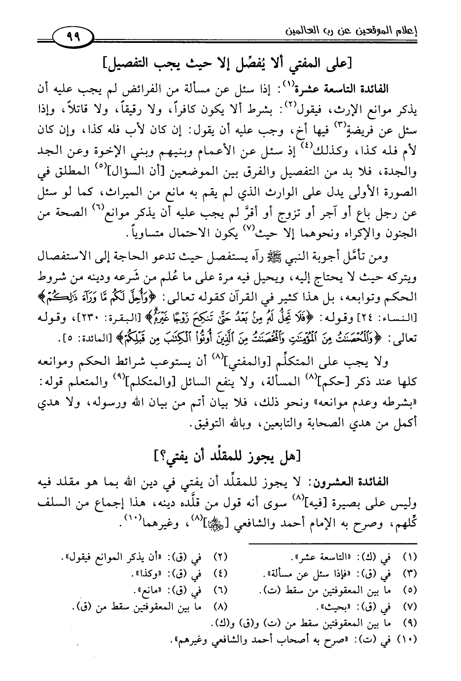 ولا يجب على المتكلِّم [والمفتي] (٨) أن يستوعب شرائط الحكم وموانعه كلها عند ذكر [حكم] (٨) المسألة، ولا ينفع السائل [والمتكلم] (٩) والمتعلم قوله: "بشرطه وعدم موانعه" ونحو ذلك، فلا بيان أتم من بيان اللَّه ورسوله، ولا هدي أكمل من هدي الصحابة والتابعين، وباللَّه التوفيق.