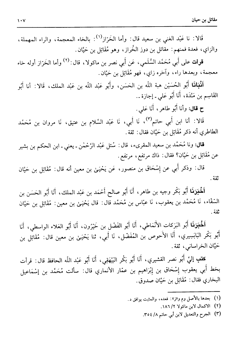 قالا نا عبد الغني بن سعيد قال وأما الخراز (1) بالخاء المعجمة والراء المهملة والزاي فعدة فمنهم مقاتل بن دوز الخراز وهو مقاتل بن حيان قرأت على أبي محمد السلمي عن أبي نصر بن ماكولا قال (2) وأما الخراز أوله خاء معجمة وبعدها راء وآخره زاي فهو مقاتل بن حيان أنبأنا أبو الحسين هبة الله بن الحسن وأبو عبد الله بن عبد الملك قالا أنا أبو القاسم بن مندة أنا أبو علي إجازة ح قال وأنا أبو طاهر أنا علي قالا أنا ابن أبي حاتم (3) نا أبي نا عبد السلام بن عتيق نا مروان بن محمد الطاطري أنه ذكر مقاتل بن حيان فقال ثقة قال ونا محمد بن سعيد المقرءى قال سئل عبد الرحمن يعني ابن الحكم بن بشير عن مقاتل بن حيان فقال ذاك مرتفع مرتفع قال وذكر أبي عن إسحاق بن منصور عن يحيى بن معين أنه قال مقاتل بن حيان ثقة أخبرنا أبو بكر وجيه بن طاهر أنا أبو صالح أحمد بن عبد الملك أنا أبو الحسن بن السقاء نا محمد بن يعقوب نا عباس بن محمد قال قال يحيى بن معين مقاتل بن حيان ثقة أخبرنا أبو البركات الأنماطي أنا أبو الفضل بن خيرون أنا أبو العلاء الواسطي أنا أبو بكر البابسيري أنا الأحوص بن المفضل نا أبي ثنا يحيى بن معين قال مقاتل بن حيان الخراساني ثقة كتب إلي أبو نصر القشيري أنا أبو بكر البيهقي أنا أبو عبد الله الحافظ قال قرأت بخط أبي يعقوب إسحاق بن إبراهيم بن عمار الأنماري قال سألت محمد بن إسماعيل البخاري فقال مقاتل بن حيان صدوق