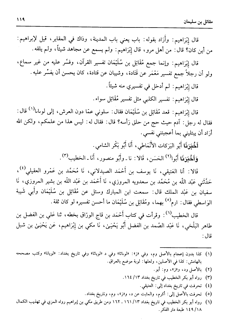 قال إبراهيم وأراد بقوله باب يعني باب المدينة وذاك في المقابر قيل لإبراهيم من أين كان قال من أهل مرو قال إبراهيم ولم يسمع عن مجاهد شيئا ولم يلقه قال إبراهيم وإنما جمع مقاتل بن سليمان تفسير القرآن وفسر عليه من غير سماع ولو أن رجلا جمع تفسير معمر عن قتادة وشيبان عن قتادة كان يحسن أن يفسر عليه قال إبراهيم لم أدخل في تفسيري منه شيئا قال إبراهيم تفسير الكلبي مثل تفسير مقاتل سواء قال إبراهيم قعد مقاتل بن سليمان فقال سلوني عما دون العرش إلى لوبابا (1) قال فقال له رجل آدم حيث حج من حلق راسه قال فقال له ليس هذا من علمكم ولكن الله أراد أن يبتليني بما أعجبتني نفسي أخبرنا أبو البركات الأنماطي أنا أبو بكر الشامي وأخبرنا أبوا (2) الحسن قالا نا وابو منصور أنا الخطيب (3) قالا أنا العتيقي نا يوسف بن أحمد الصيدلاني نا محمد بن عمرو العقيلي (4) حدثني عبد الله بن محمد بن سعدويه المروزي نا أحمد بن عبد الله بن بشير المروزي نا سفيان بن عبد الملك قال سمعت ابن المبارك وسئل عن مقاتل بن سليمان وأبي شيبة الواسطي فقال ارم (5) بهما ومقاتل بن سليمان ما أحسن تفسيره لو كان ثقة قال الخطيب (6) وقرأت في كتاب أحمد بن قاج الوراق بخطه ثنا علي بن الفضل بن طاهر البلخي نا عبد الصمد بن الفضل أبو يحيى نا مكي بن إبراهيم عن يحيى بن شبل قال
