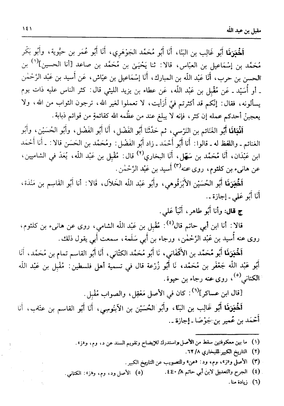 أخبرنا أبو غالب بن البنا أنا أبو محمد الجوهري أنا أبو عمر بن حيوية وأبو بكر محمد بن إسماعيل بن العباس قالا ثنا يحيى بن محمد بن صاعد أنا الحسين (1) بن الحسن بن حرب أنا عبد الله بن المبارك أنا إسماعيل بن عياش عن أسيد بن عبد الرحمن أو أسيد عن مقبل بن عبد الله عن عطاء بن يزيد الليثي قال كثر الناس عليه ذات يوم يسألونه فقال إنكم قد أكثرتم في أرأيت لا تعملوا لغير الله ترجون الثواب من الله ولا يعجبن أحدكم عمله إن كثر فإنه لا يبلغ عند من عظمه الله كقائمة من قوائم ذبابة أنبأنا أبو الغنائم بن النرسي ثم حدثنا أبو الفضل أنا أبو الفضل وأبو الحسين وأبو الغنائم واللفظ له قالوا أنا أبو أحمد زاد أبو الفضل ومحمد بن الحسن قالا أنا أحمد ابن عبدان أنا محمد بن سهل أنا البخاري (2) قال مقبل بن عبد الله يعد في الشاميين عن هانئ بن كلثوم روى عنه (3) أسيد بن عبد الرحمن أخبرنا أبو الحسين الأبرقوهي وأبو عبد الله الخلال قالا أنا أبو القاسم بن مندة أنا أبو علي إجازة ح قال وأنا أبو طاهر أنبأ علي قالا أنا ابن أبي حاتم قال (4) مقبل بن عبد الله الشامي روى عن هانئ بن كلثوم روى عنه أسيد بن عبد الرحمن ورجاء بن أبي سلمة سمعت أبي يقول ذلك أخبرنا أبو محمد بن الأكفاني نا أبو محمد الكتاني أنا أبو القاسم تمام بن محمد أنا أبو عبد الله جعفر بن محمد نا أبو زرعة قال في تسمية أهل فلسطين مقبل بن عبد الله الكناني (5) روى عنه رجاء بن حيوة قال ابن عساكر (6) كان في الأصل معقل والصواب مقبل أخبرنا أبو غالب بن البنا وأبو الحسين بن الآبنوسي أنا أبو القاسم بن عتاب أنا أحمد بن عمير بن جوصا إجازة