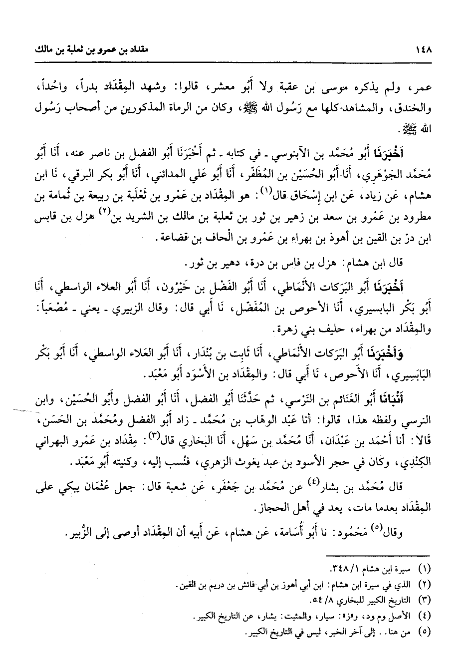 عمر ولم يذكره موسى بن عقبة ولا أبو معشر قالوا وشهد المقداد بدرا وأحدا والخندق والمشاهد كلها مع رسول الله (صلى الله عليه وسلم) وكان من الرماة المذكورين من أصحاب رسول الله (صلى الله عليه وسلم) أخبرنا أبو محمد بن الآبنوسي في كتابه ثم أخبرنا أبو الفضل بن ناصر عنه أنا أبو محمد الجوهري أنا أبو الحسين بن المظفر أنا أبو علي المدائني أنا أبو بكر البرقي نا ابن هشام عن زياد عن ابن إسحاق قال (1) هو المقداد بن عمرو بن ثعلبة بن ربيعة بن ثمامة بن مطرود بن عمرو بن سعد بن زهير بن ثور بن ثعلبة بن مالك بن الشريد بن (2) هزل بن قابس ابن در بن القين بن أهوذ بن بهراء بن عمرو بن الحاف بن قضاعة قال ابن هشام هزل بن فاس بن درة دهير بن ثور أخبرنا أبو البركات الأنماطي أنا أبو الفضل بن خيرون أنا أبو العلاء الواسطي أنا أبو بكر البابسيري أنا الأحوص بن المفضل نا أبي قال وقال الزبيري يعني مصعبا والمقداد من بهراء حليف بني زهرة وأخبرنا أبو البركات الأنماطي أنا ثابت بن بندار أنا أبو العلاء الواسطي أنا أبو بكر البابسيري أنا الأحوص نا أبي قال والمقداد بن الأسود أبو معبد أنبأنا أبو الغنائم بن النرسي ثم حدثنا أبو الفضل أنا أبو الفضل وأبو الحسين وابن النرسي ولفظه هذا قالوا أنا عبد الوهاب بن محمد زاد أبو الفضل ومحمد بن الحسن قالا أنا أحمد بن عبدان أنا محمد بن سهل أنا البخاري قال (3) مقدام بن عمرو البهراني الكندي وكان في حجر الأسود بن عبد يغوث الزهري فنسب إليه وكنيته أبو معبد قال محمد بن بشار (4) عن محمد بن جعفر عن شعبة قال جعل عثمان يبكي على المقداد بعدما مات يعد في أهل الحجاز وقال (5) محمود نا أبو أسامة عن هشام عن أبيه أن المقداد أوصى إلى الزبير