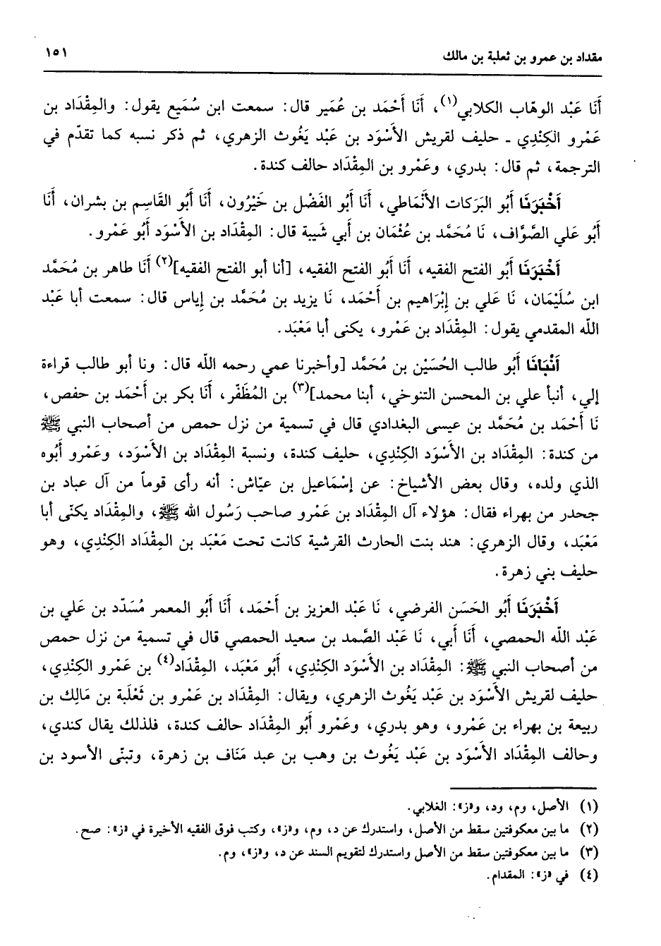أنا عبد الوهاب الكلابي (1) أنا أحمد بن عمير قال سمعت ابن سميع يقول والمقداد بن عمرو الكندي حليف لقريش الأسود بن عبد يغوث الزهري ثم ذكر نسبه كما تقدم في الترجمة ثم قال بدري وعمرو بن المقداد حالف كندة أخبرنا أبو البركات الأنماطي أنا أبو الفضل بن خيرون أنا أبو القاسم بن بشران أنا أبو علي الصواف نا محمد بن عثمان بن أبي شيبة قال المقداد بن الأسود أبو عمرو أخبرنا أبو الفتح الفقيه أنا أبو الفتح الفقيه أنا أبو الفتح الفقيه (2) أنا طاهر بن محمد ابن سليمان نا علي بن إبراهيم بن أحمد نا يزيد بن محمد بن إياس قال سمعت أبا عبد الله المقدمي يقول المقداد بن عمرو يكنى أبا معبد أنبأنا أبو طالب الحسين بن محمد وأخبرنا عمي رحمه الله قال ونا أبو طالب قراءة إلي أنبأ علي بن المحسن التنوخي ابنا محمد (3) بن المظفر أنا بكر بن أحمد بن حفص نا أحمد بن محمد بن عيسى البغدادي قال في تسمية من نزل حمص من أصحاب النبي (صلى الله عليه وسلم) من كندة المقداد بن الأسود الكندي حليف كندة ونسبة المقداد بن الأسود وعمرو أبوه الذي ولده وقال بعض الأشياخ عن إسماعيل بن عياش أنه رأى قوما من آل عباد بن جحدر من بهراء فقال هؤلاء آل المقداد بن عمرو صاحب رسول الله (صلى الله عليه وسلم) والمقداد يكنى أبا معبد وقال الزهري هند بنت الحارث القرشية كانت تحت معبد بن المقداد الكندي وهو حليف بني زهرة أخبرنا أبو الحسن الفرضي نا عبد العزيز بن أحمد أنا أبو المعمر مسدد بن علي بن عبد الله الحمصي أنا أبي نا عبد الصمد بن سعيد الحمصي قال في تسمية من نزل حمص من أصحاب النبي (صلى الله عليه وسلم) المقداد بن (4) الأسود الكندي أبو معبد المقداد بن عمرو الكندي حليف لقريش الأسود بن عبد يغوث الزهري ويقال المقداد بن عمرو بن ثعلبة بن مالك بن ربيعة بن بهراء بن عمرو وهو بدري وعمرو أبو المقداد حالف كندة فلذلك يقال كندي وحالف المقداد الأسود بن عبد يغوث بن وهب بن عبد مناف بن زهرة وتبنى الأسود بن