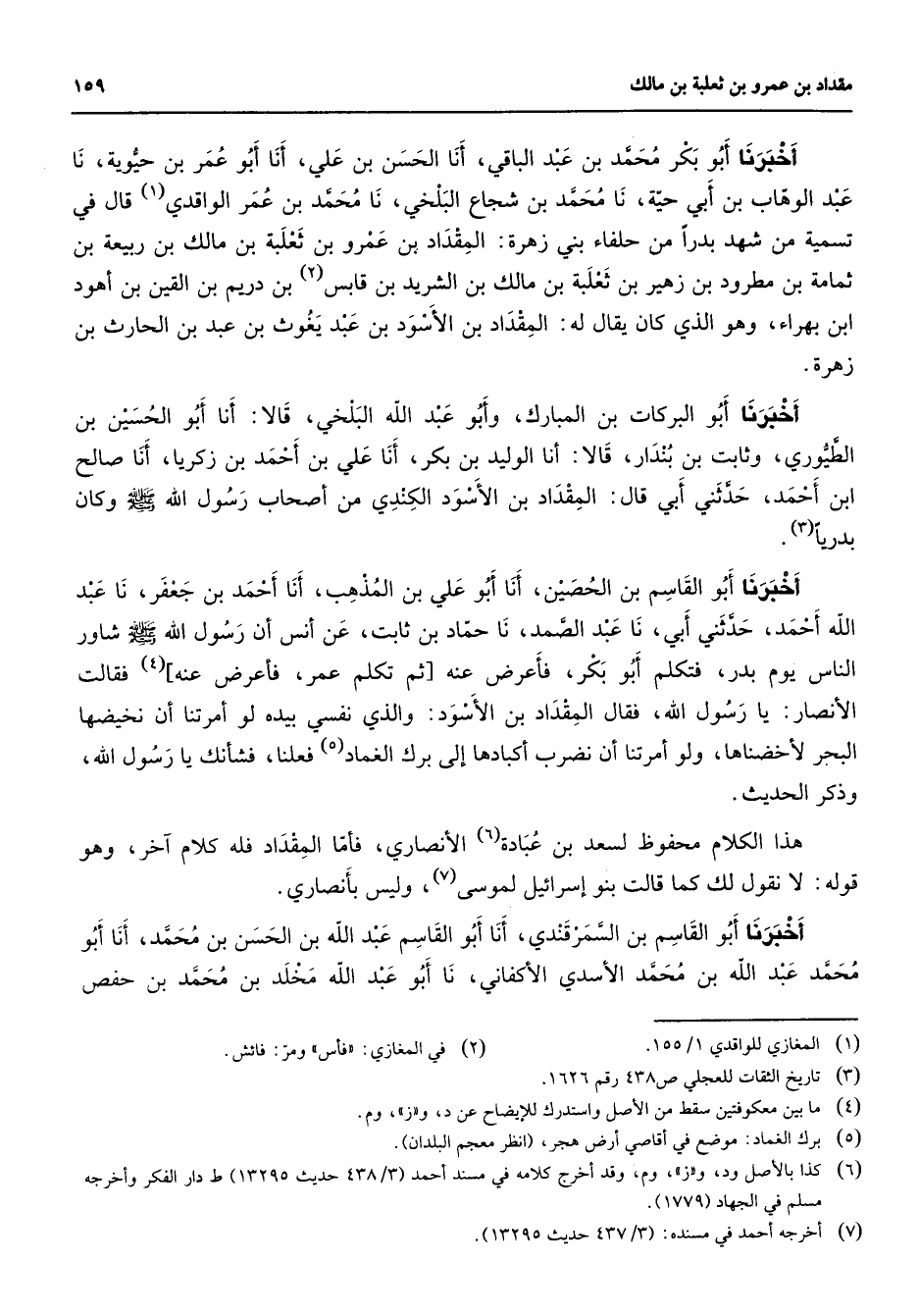 أخبرنا أبو بكر محمد بن عبد الباقي أنا الحسن بن علي أنا أبو عمر بن حيوية نا عبد الوهاب بن أبي حية نا محمد بن شجاع البلخي نا محمد بن عمر الواقدي (1) قال في تسمية من شهد بدرا من حلفاء بني زهرة المقداد بن عمرو بن ثعلبة بن مالك بن ربيعة بن ثمامة بن مطرود بن زهير بن ثعلبة بن مالك بن الشريد بن قابس (2) بن دريم بن القين بن أهود ابن بهراء وهو الذي كان يقال له المقداد بن الأسود بن عبد يغوث بن عبد الحارث بن زهرة أخبرنا أبو البركات بن المبارك وأبو عبد الله البلخي قالا أنا أبو الحسين بن الطيوري وثابت بن بندار قالا أنا أبو الوليد بن بكر أنا علي بن أحمد بن زكريا أنا صالح ابن أحمد حدثني أبي قال المقداد بن الأسود الكندي من أصحاب رسول الله (صلى الله عليه وسلم) وكان بدريا (3) أخبرنا أبو القاسم بن الحصين أنا أبو علي بن المذهب أنا أحمد بن جعفر نا عبد الله أحمد حدثني أبي نا عبد الصمد نا حماد بن ثابت عن أنس أن رسول الله (صلى الله عليه وسلم) شاور الناس يوم بدر فتكلم أبو بكر فأعرض عنه ثم تكلم عمر فأعرض عنه (4) فقالت الأنصار يا رسول الله فقال المقداد بن الأسود والذي نفسي بيده لو أمرتنا أن أن نخيضها البحر لأخضناها ولو أمرتنا أن نضرب أكبادها إلى برك الغماد فعلنا فشأنك يا رسول الله وذكر الحديث هذا الكلام محفوظ لسعد بن عبادة (6) الأنصاري فأما المقداد فله كلام آخر وهو قوله لا نقول لك كما قالت بنو إسرائيل لموسى (7) وليس بأنصاري أخبرنا أبو القاسم بن السمرقندي أنا أبو القاسم عبد الله بن الحسن بن محمد أنا أبو محمد عبد الله بن محمد الأسدي الأكفاني نا أبو عبد الله مخلد بن محمد بن حفص