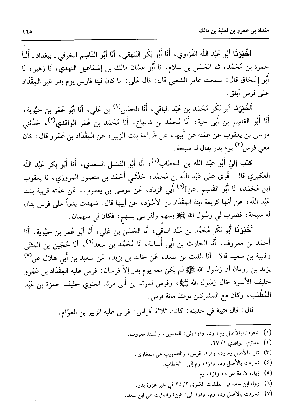 أخبرنا أبو عبد الله الفراوي أنا أبو بكر البيهقي أنا أبو القاسم الخرقي ببغداد أنبأ حمزة بن محمد ثنا الحسن بن سلام نا أبو غسان مالك بن إسماعيل النهدي نا زهير نا أبو إسحاق قال سمعت عامر الشعبي قال قال علي ما كان فينا فارس يوم بدر غير المقداد على فرس أبلق أخبرنا أبو بكر محمد بن عبد الباقي أنا الحسن (1) بن علي أنا أبو عمر بن حيوية أنا أبو القاسم بن أبي حية أنا محمد بن شجاع أنا محمد بن عمر الواقدي (2) حدثني موسى بن يعقوب عن عمته عن أبيها عن ضباعة بنت الزبير عن المقداد بن عمرو قال كان معي فرس (3) يوم بدر يقال له سبحة كتب إلي أبو عبد الله بن الحطاب (4) أنا أبو الفضل السعدي أنا أبو بكر عبد الله العكبري قال قرئ على عبد الله بن محمد حدثني أحمد بن منصور المروزي نا يعقوب ابن محمد نا أبو القاسم عن (5) أبي الزناد عن موسى بن يعقوب عن عمته قريبة بنت عبد الله عن أمها كريمة ابنة المقداد بن الأسود عن أبيها قال شهدت بدرا على فرس يقال له سبحة فضرب لي رسول الله (صلى الله عليه وسلم) بسهم ولفرسي بسهم فكان لي سهمان أخبرنا أبو بكر محمد بن عبد الباقي أنا الحسن بن علي أنا أبو عمر بن حيوية أنا أحمد بن معروف أنا الحارث بن أبي أسامة نا محمد بن سعد (6) أنا حجين بن المثنى وقتيبة بن سعيد قالا أنا الليث بن سعد عن خالد بن يزيد عن سعيد بن أبي هلال عن (7) يزيد بن رومان أن رسول الله (صلى الله عليه وسلم) لم يكن معه يوم بدر إلا فرسان فرس عليه المقداد بن عمرو حليف الأسود خال رسول الله (صلى الله عليه وسلم) وفرس لمرثد بن أبي مرثد الغنوي حليف حمزة بن عبد المطلب وكان مع المشركين يومئذ مائة فرس قال قال قتيبة في حديثه كانت ثلاثة أفراس فرس عليه الزبير بن العوام