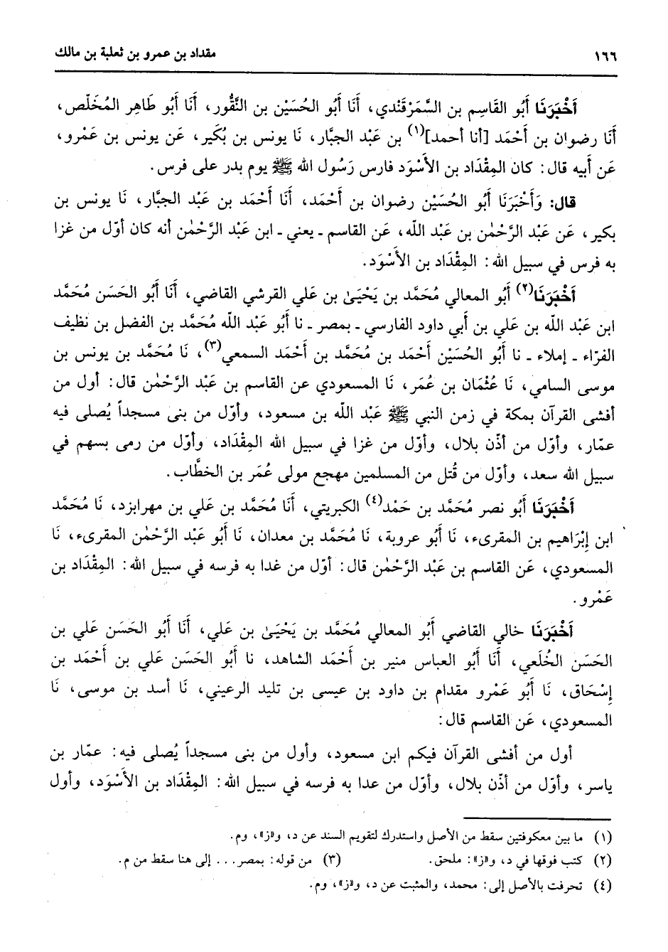 أخبرنا أبو القاسم بن السمرقندي أنا أبو الحسين بن النقور أنا أبو طاهر المخلص أنا رضوان بن أحمد أنا أحمد (1) بن عبد الجبار نا يونس بن بكير عن يونس بن عمرو عن أبيه قال كان المقداد بن الأسود فارس رسول الله (صلى الله عليه وسلم) يوم بدر على فرس قال وأخبرنا أبو الحسين رضوان بن أحمد أنا أحمد بن عبد الجبار نا يونس بن بكير عن عبد الرحمن بن عبد الله عن القاسم يعني ابن عبد الرحمن أنه كان أول من غزا به فرس في سبيل الله المقداد بن الأسود أخبرنا (2) أبو المعالي محمد بن يحيى بن علي القرشي القاضي أنا أبو الحسن محمد ابن عبد الله بن علي بن أبي داود الفارسي بمصر نا أبو عبد الله محمد بن الفضل بن نظيف الفراء إملاء نا أبو الحسين أحمد بن محمد بن أحمد السمعي (3) نا محمد بن يونس بن موسى السامي نا عثمان بن عمر نا المسعودي عن القاسم بن عبد الرحمن قال أول من أفشى القرآن بمكة في زمن النبي (صلى الله عليه وسلم) عبد الله بن مسعود وأول من بنى مسجدا يصلى فيه عمار وأول من أذن بلال وأول من غزا في سبيل الله المقداد وأول من رمى بسهم في سبيل الله سعد وأول من قتل من المسلمين مهجع مولى عمر بن الخطاب أخبرنا أبو نصر محمد بن حمد (4) الكبريتي أنا محمد بن علي بن مهرابزد نا محمد ابن إبراهيم بن المقرئ نا أبو عروبة نا محمد بن معدان نا أبو عبد الرحمن المقرئ نا المسعودي عن القاسم بن عبد الرحمن قال أول من غدا به فرسه في سبيل الله المقداد بن عمرو أخبرنا خالي القاضي أبو المعالي محمد بن يحيى بن علي أنا أبو الحسن علي بن الحسن الخلعي أنا أبو العباس منير بن أحمد الشاهد نا أبو الحسن علي بن أحمد بن إسحاق نا أبو عمرو مقدام بن داود بن عيسى بن تليد الرعيني نا أسد بن موسى نا المسعودي عن القاسم قال أول من أفشى القرآن فيكم ابن مسعود وأول من بنى مسجدا يصلى فيه عمار بن ياسر وأول من أذن بلال وأول من عدا به فرسه في سبيل الله المقداد بن الأسود وأول