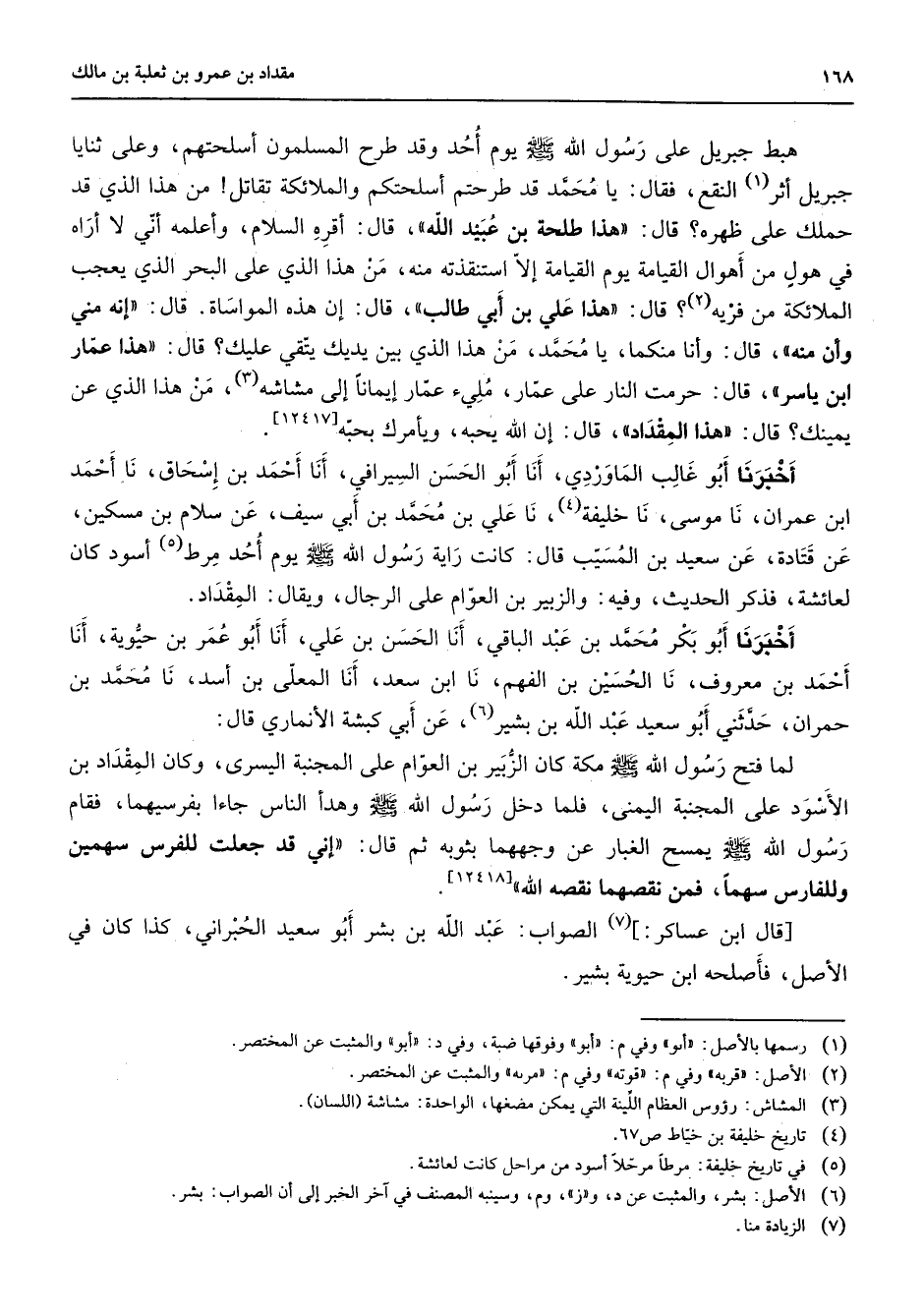 هبط جبريل على رسول الله (صلى الله عليه وسلم) يوم أحد وقد طرح المسلمون أسلحتهم وعلى ثنايا جبريل أثر (1) النقع فقال يا محمد قد طرحتم أسلحتكم والملائكة تقاتل من هذا الذي قد حملك على ظهره قال هذا طلحة بن عبيد الله قال أقره السلام وأعلمه أني لا أراه في هول من أهوال القيامة يوم القيامة إلا استنقذته منه من هذا الذي على البحر الذي يعجب الملائكة من فريه (2) قال هذا علي بن أبي طالب قال إن هذه المواساة قال إنه مني وأن منه قال وأنا منكما يا محمد من هذا الذي بين يديك يتقي عليك قال هذا عمار بن ياسر قال حرمت النار على عمار ملئ عمار إيمانا إلى مشاشه (3) من هذا الذي عن يمينك قال هذا المقداد قال إن الله يحبه ويأمرك بحبه