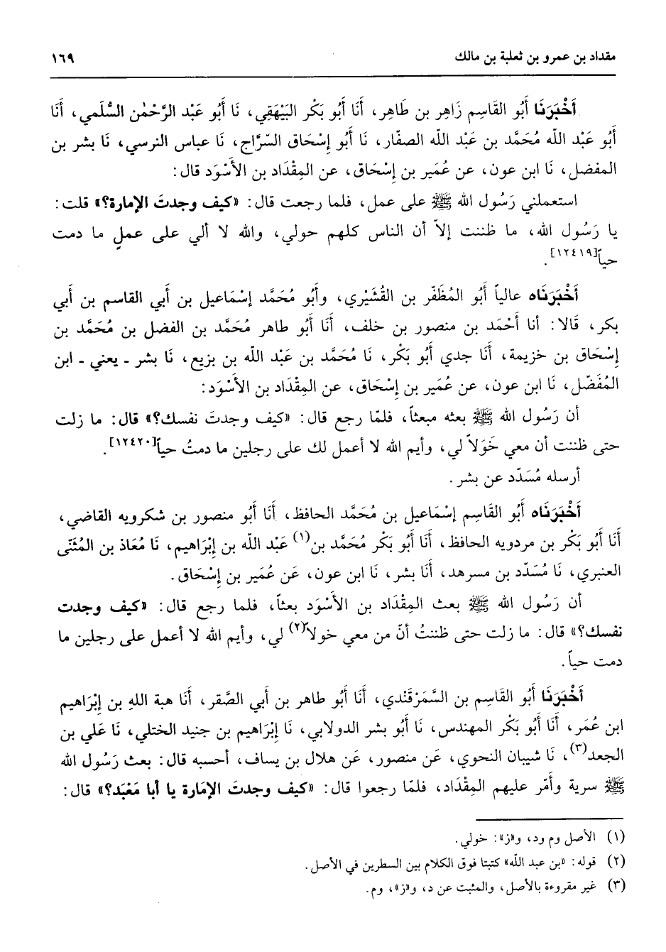 [12420] أرسله مسدد عن بشر أخبرناه أبو القاسم إسماعيل بن محمد الحافظ أنا أبو منصور بن شكرويه القاضي أنا أبو بكر بن مردويه الحافظ أنا أبو بكر محمد بن (1) عبد الله بن إبراهيم نا معاذ بن المثنى العنبري نا مسدد بن مسرهد أنا بشر نا ابن عون عن عمير بن إسحاق أن رسول الله (صلى الله عليه وسلم) بعث المقداد بن الأسود بعثا فلما رجع قال كيف وجدت نفسك قال ما زلت حتى ظننت أن من معي خولا (2) لي وأيم الله لا أعمل على رجلين ما دمت حيا أخبرنا أبو القاسم بن السمرقندي أنا أبو طاهر بن أبي الصقر أنا هبة الله بن إبراهيم ابن عمر أنا أبو بكر المهندس نا أبو بشر الدولابي نا إبراهيم بن جنيد الختلي نا علي بن الجعد (3) نا شيبان النحوي عن منصور عن هلال بن يساف أحسبه قال بعث رسول الله (صلى الله عليه وسلم) سرية وأمر عليهم المقداد فلما رجعوا قال كيف وجدت الإمارة يا أبا معبد قال