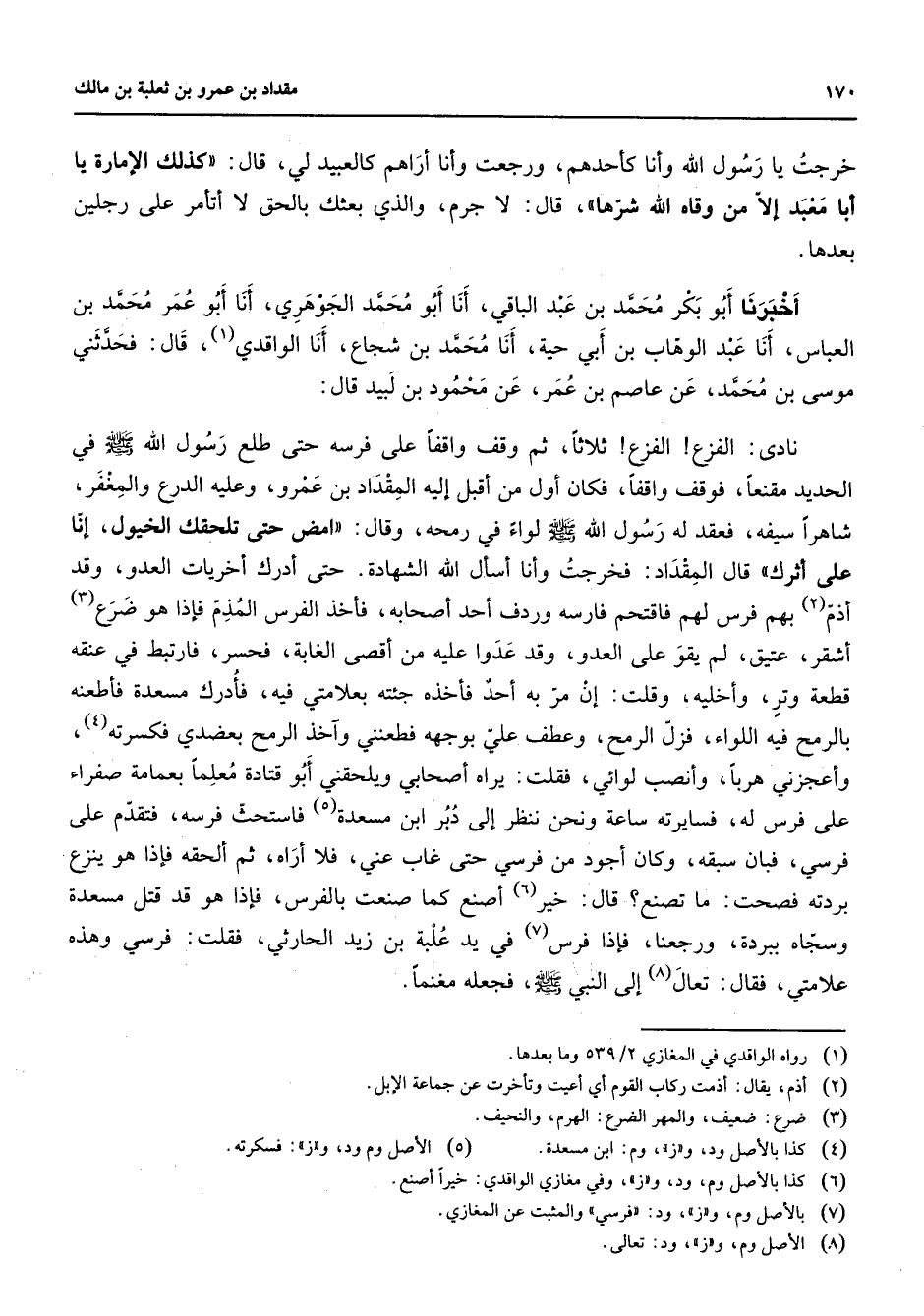 خرجت يا رسول الله وأنا كأحدهم ورجعت وأنا أراهم كالعبيد لي قال كذلك الإمارة يا أبا معبد إلا من وقاه الله شرها قال لا جرم والذي بعثك بالحق لا أتأمر على رجلين بعدها أخبرنا أبو بكر محمد بن عبد الباقي أنا أبو محمد الجوهري أنا أبو عمر محمد بن العباس أنا عبد الوهاب بن أبي حية أنا محمد بن شجاع أنا الواقدي (1) قال فحدثني موسى بن محمد عن عاصم بن عمر عن محمود بن لبيد قال نادى الفزع الفزع ثلاثا ثم وقف واقفا على فرسه حتى طلع رسول الله (صلى الله عليه وسلم) في الحديد مقنعا فوقف واقفا فكان أول من أقبل إليه المقداد بن عمرو وعليه الدرع والمغفر شاهرا سيفه فعقد له رسول الله (صلى الله عليه وسلم) لواء في رمحه وقال امض حتى تلحقك الخيول إنا على أثرك قال المقداد فخرجت وأنا أسأل الله الشهادة حتى أدرك أخريات العدو وقد أذم (2) بهم فرس لهم فاقتحم فارسه وردف أحد أصحابه فأخذ الفرس المذم فإذا هو ضرع (3) أشقر عتيق لم يقو على العدو وقد عدوا عليه من أقصى الغابة فحسر فارتبط في عنقه قطعة وتر وأخليه وقلت إن مر به أحد فأخذه جئته بعلامتي فيه فأدرك مسعدة فأطعنه بالرمح فيه اللواء فزل الرمح وعطف علي بوجهه فطعنني وأخذ الرمح بعضدي فكسرته (4) وأعجزني هربا وأنصب لوائي فقلت يراه أصحابي ويلحقني أبو قتادة معلما بعمامة صفراء على فرس له فسايرته ساعة ونحن ننظر إلى دبر ابن مسعدة (5) فاستحث فرسه فتقدم على فرسي فبان سبقه وكان أجود من فرسي حتى غاب عني فلا أراه ثم ألحقه فإذا هو ينزع بردته فصحت ما تصنع قال خير (6) أصنع كما صنعت بالفرس فإذا هو قد قتل مسعدة وسجاه ببردة ورجعنا فإذا فرس (7) في يد علبة بن زيد الحارثي فقلت فرسي وهذه علامتي فقال تعال (8) إلى النبي (صلى الله عليه وسلم) فجعله مغنما