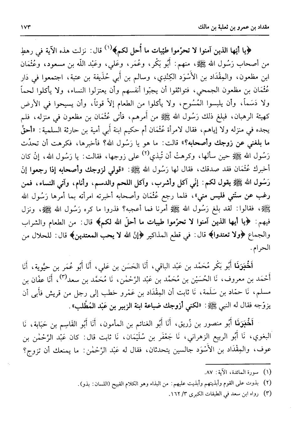 " يا أيها الذين آمنوا لا تحرموا طيبات ما أحل لكم " (1) قال نزلت هذه الآية في رهط من أصحاب رسول الله (صلى الله عليه وسلم) منهم أبو بكر وعمر وعلي وعبد الله بن مسعود وعثمان ابن مظعون والمقداد بن الأسود الكندي وسالم بن أبي حذيفة بن عتبة اجتمعوا في دار عثمان بن مظعون الجمحي فتواثقوا أن يجبوا أنفسهم وأن يعتزلوا النساء ولا يأكلوا لحما ولا دسما وأن يلبسو المسوح ولا يأكلوا من الطعام إلا قوتا وأن يسيحوا في الأرض كهيئة الرهبان فبلغ ذلك رسول الله (صلى الله عليه وسلم) من أمرهم فأتى عثمان بن مظعون في منزله فلم يجده في منزله ولا إياهم فقال لامرأة عثمان أم حكيم ابنة أبي أمية بن حارثة السلمية أحق ما بلغني عن زوجك وأصحابه قالت ما هو يا رسول الله فأخبرها فكرهت أن تحدث رسول الله (صلى الله عليه وسلم) حين سألها وكرهت أن تبذي (2) على زوجها فقالت يا رسول الله إن كان أخبرك عثمان فقد صدقك فقال لها رسول الله (صلى الله عليه وسلم) قولي لزوجك وأصحابه إذا رجعوا إن رسول الله (صلى الله عليه وسلم) يقول لكم إني آكل وأشرب وآكل اللحم والدسم وأنام وآتي النساء فمن رغب عن سنتي فليس مني فلما رجع عثمان وأصحابه أخبرته امرأته بما أمرها رسول الله (صلى الله عليه وسلم) فقالوا لقد بلغ رسول الله (صلى الله عليه وسلم) أمرنا فما أعجبه فذروا ما كره رسول الله (صلى الله عليه وسلم) ونزل فيهم " يا أيها الذين آمنوا لا تحرموا طيبات ما أحل الله لكم " قال من الطعام والشراب والجماع " ولا تعتدوا " قال في قطع المذاكير " إن الله لا يحب المعتدين " قال للحلال من الحرام أخبرنا أبو بكر محمد بن عبد الباقي أنا الحسن بن علي أنا أبو عمر بن حيوية أنا أحمد بن معروف نا الحسين بن محمد بن عبد الرحمن نا محمد بن سعد (3) أنا عفان بن مسلم نا حماد بن سلمة نا ثابت أن المقداد بن عمرو خطب إلى رجل من قريش فأبى أن يزوجه فقال له النبي (صلى الله عليه وسلم) لكني أزوجك ضباعة ابنة الزبير بن عبد المطلب أخبرنا أبو منصور بن زريق أنا أبو الغنائم بن المأمون أنا أبو القاسم بن حبابة نا البغوي نا أبو الربيع الزهراني نا جعفر بن سليمان نا ثابت قال كان عبد الرحمن بن عوف والمقداد بن الأسود جالسين يتحدثان فقال له عبد الرحمن ما يمنعك أن تزوج