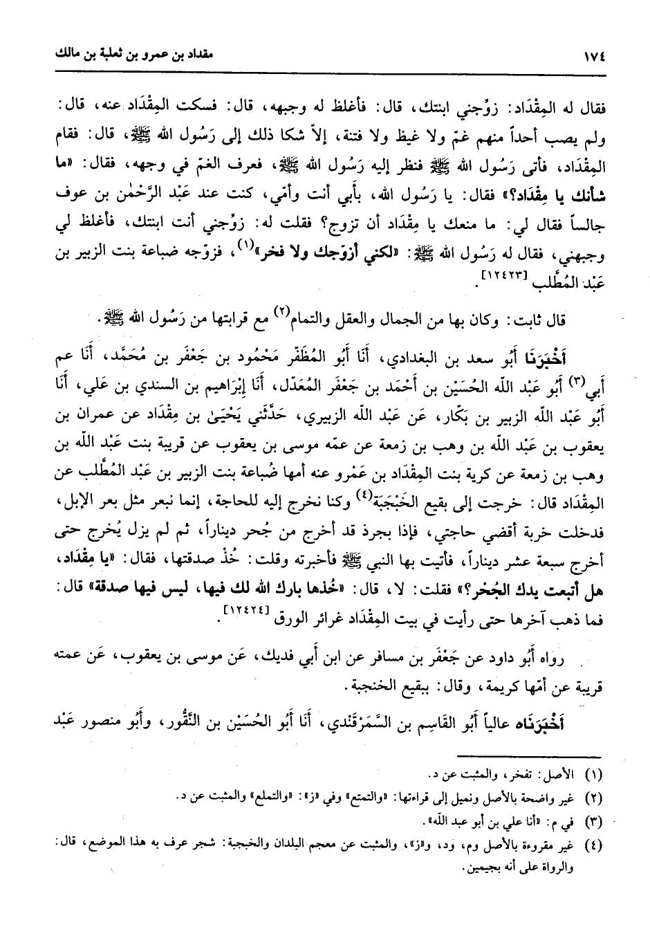 فقال له المقداد زوجني ابنتك قال فأغلظ له وجبهه قال فسكت المقداد عنه قال ولم يصب أحدا منهم غم ولا غيظ ولا فتنة إلا شكا ذلك إلى رسول الله (صلى الله عليه وسلم) قال فقام المقداد فأتى رسول الله (صلى الله عليه وسلم) فنظر إليه رسول الله (صلى الله عليه وسلم) فعرف الغم في وجهه فقال ما شأنك يا مقداد فقال يا رسول الله بأبي أنت وأمي كنت عند عبد الرحمن بن عوف جالسا فقال لي ما منعك يا مقداد أن تزوج فقلت له زوجني أنت ابنتك فأغلظ لي وجبهني فقال له رسول الله (صلى الله عليه وسلم) لكني أزوجك ولا فخر (1) فزوجه ضباعة بنت الزبير بن عبد المطلب
