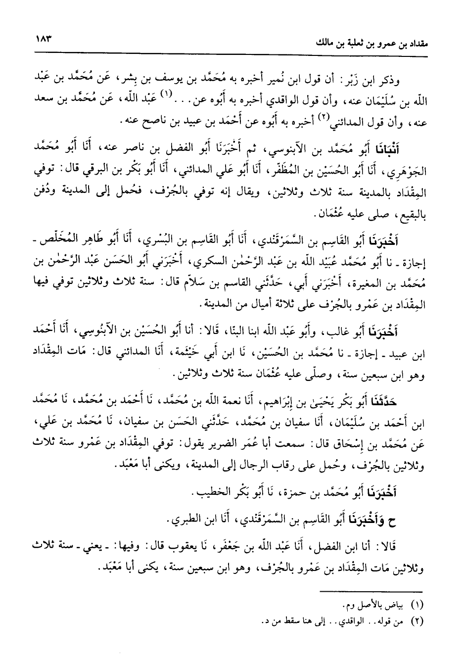 (1) عبد الله عن محمد بن سعد عنه وأن قول المدائني (2) أخبره به أبوه عن أحمد بن عبيد بن ناصح عنه أنبأنا أبو محمد بن الآبنوسي ثم أخبرنا أبو الفضل بن ناصر عنه أنا أبو محمد الجوهري أنا أبو الحسين بن المظفر أنا أبو علي المدائني أنا أبو بكر بن البرقي قال توفي المقداد بالمدينة سنة ثلاث وثلاثين ويقال إنه توفي بالجرف فحمل إلى المدينة ودفن بالبقيع صلى عليه عثمان أخبرنا أبو القاسم بن السمرقندي أنا أبو القاسم بن البسري أنا أبو طاهر المخلص إجازة نا أبو محمد عبيد الله بن عبد الرحمن السكري أخبرني أبو الحسن عبد الرحمن بن محمد بن المغيرة أخبرني أبي حدثني القاسم بن سلام قال سنة ثلاث وثلاثين توفي فيها المقداد بن عمرو بالجرف على ثلاثة أميال من المدينة أخبرنا أبو غالب وأبو عبد الله ابنا البنا قالا أنا أبو الحسين بن الآبنوسي أنا أحمد ابن عبيد إجازة نا محمد بن الحسين نا ابن ابي خيثمة أنا المدائني قال مات المقداد وهو ابن سبعين سنة وصلى عليه عثمان سنة ثلاث وثلاثين حدثنا أبو بكر يحيى بن إبراهيم أنا نعمة الله بن محمد نا أحمد بن محمد نا محمد ابن أحمد بن سليمان أنا سفيان بن محمد حدثني الحسن بن سفيان نا محمد بن علي عن محمد بن إسحاق قال سمعت أبا عمر الضرير يقول توفي المقداد بن عمرو سنة ثلاث وثلاثين بالجرف وحمل على رقاب الرجال إلى المدينة ويكنى أبا معبد أخبرنا أبو محمد بن حمزة نا أبو بكر الخطيب ح وأخبرنا أبو القاسم بن السمرقندي أنا ابن الطبري قالا أنا ابن الفضل أنا عبد الله بن جعفر نا يعقوب قال وفيها يعني سنة ثلاث وثلاثين مات المقداد بن عمرو بالجرف وهو ابن سبعين سنة يكنى ابا معبد