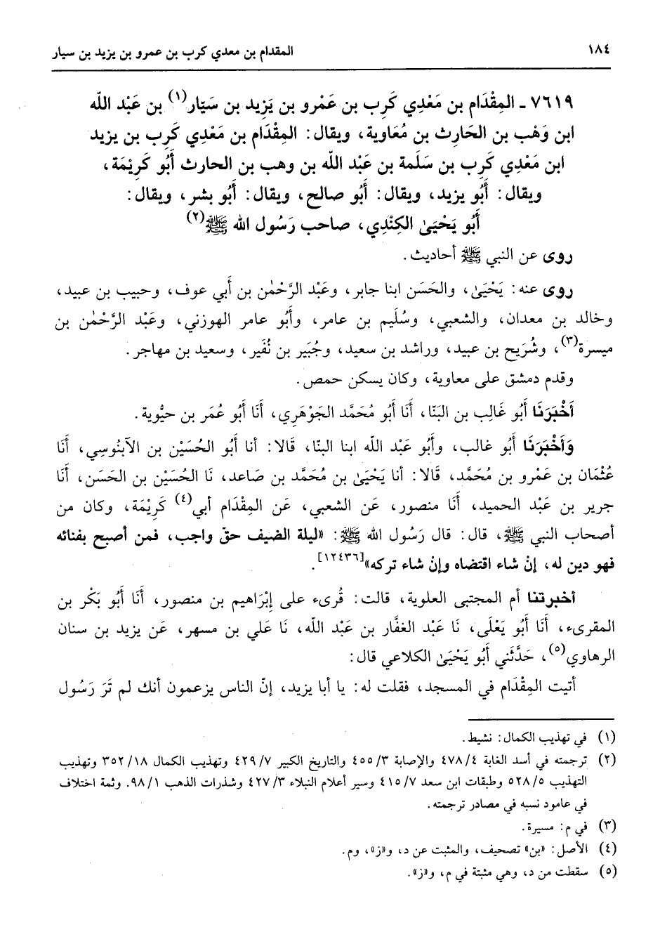 7619 - المقدام بن معدي كرب بن عمرو بن يزيد بن سيار (1) بن عبد الله ابن وهب بن الحارث بن معاوية ويقال المقدام بن معدي كرب بن يزيد ابن معدي كرب بن سلمة بن عبد الله بن وهب بن الحارث أبو كريمة ويقال أبو يزيد ويقال أبو صالح ويقال أبو بشر ويقال أبو يحيى الكندي صاحب رسول الله (صلى الله عليه وسلم) (2) روى عن النبي (صلى الله عليه وسلم) أحاديث روى عنه يحيى والحسن ابنا جابر وعبد الرحمن بن أبي عوف وحبيب بن عبيد وخالد بن معدان والشعبي وسليم بن عامر وابو عامر الهوزني وعبد الرحمن بن ميسرة (3) وشريح بن عبيد وراشد بن سعيد وجبير بن نفير وسعيد بن مهاجر وقدم دمشق على معاوية وكان يسكن حمص أخبرنا أبو غالب بن البنا أنا أبو محمد الجوهري أنا أبو عمر بن حيوية وأخبرنا أبو غالب وأبو عبد الله ابنا البنا قالا أنا أبو الحسين بن الآبنوسي أنا عثمان بن عمرو بن محمد قالا أنا يحيى بن محمد بن صاعد نا الحسين بن الحسن أنا جرير بن عبد الحميد أنا منصور عن الشعبي عن المقدام أبي (4) كريمة وكان من أصحاب النبي (صلى الله عليه وسلم) قال قال رسول الله (صلى الله عليه وسلم) ليلة الضيف حق واجب فمن أصبح بفنائه فهو دين له إن شاء اقتضاه وإن شاء تركه