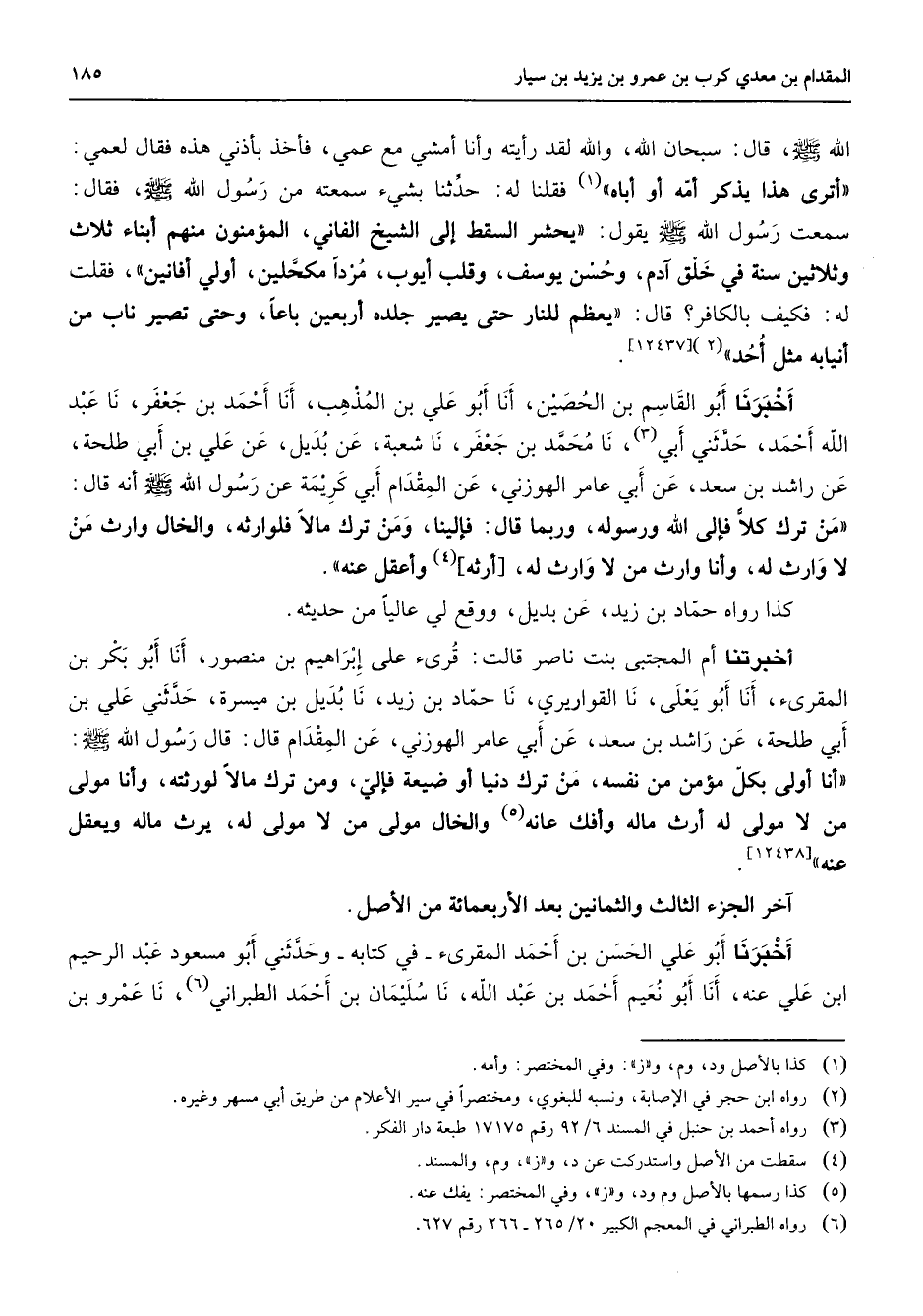[12437] أخبرنا أبو القاسم بن الحصين أنا أبو علي بن المذهب أنا أحمد بن جعفر نا عبد الله أحمد حدثني أبي (3) نا محمد بن جعفر نا شعبة عن بديل عن علي بن أبي طلحة عن راشد بن سعد عن أبي عامر الهوزني عن المقدام أبي كريمة عن رسول الله (صلى الله عليه وسلم) أنه قال من ترك كلا فإلى الله ورسوله وربما قال فإلينا ومن ترك مالا فلوارثه والخال وارث من لا وارث له وأنا وارث أنا لا وارث له أرثه (4) وأعقل عنه كذا رواه حماد بن زيد عن بديل ووقع لي عاليا من حديثه أخبرتنا أم المجتبى بنت ناصر قالت قرئ على إبراهيم بن منصور أنا أبو بكر بن المقرئ أنا أبو يعلى نا القواريري نا حماد بن زيد نا بديل بن ميسرة حدثني علي بن أبي طلحة عن راشد بن سعد عن أبي عامر الهوزني عن المقدام قال قال رسول الله (صلى الله عليه وسلم) أنا أولى بكل مؤمن من نفسه من ترك دنيا أو ضيعة فإلى ومن ترك مالا لورثته وأنا مولى من لا مولى له ارث ماله وأفك عانه (5) والخال مولى من لا مولى له يرث ماله ويعقل عنه