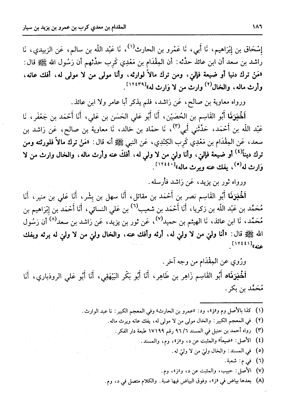 إسحاق بن إبراهيم نا أبي نا عمرو بن الحارث (1) نا عبد الله بن سالم عن الزبيدي نا راشد بن سعد أن ابن عائذ حدثه أن المقدام بن معدي كرب حدثهم أن رسول الله (صلى الله عليه وسلم) قال من ترك دنيا أو ضيعة فإلي ومن ترك مالا لوارثه وأنا مولى من لا مولى له أفك عانه وأرث ماله والخال (2) وارث من لا وارث له
