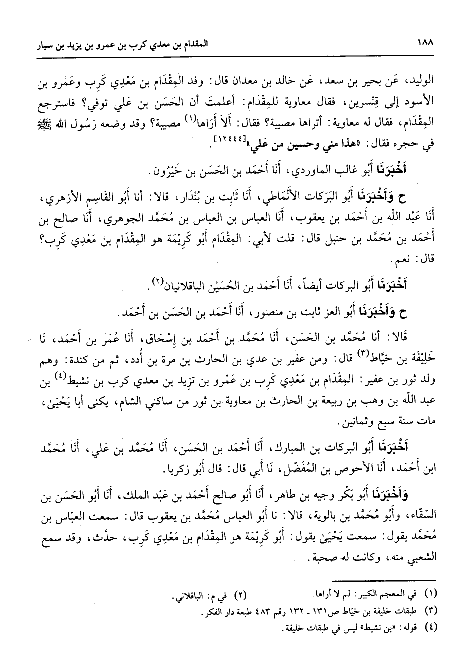 [12444] أخبرنا أبو غالب الماوردي أنا أحمد بن الحسن بن خيرون ح وأخبرنا أبو البركات الأنماطي أنا ثابت بن بندار قالا أنا أبو القاسم الأزهري أنا عبد الله بن أحمد بن يعقوب أنا العباس بن العباس بن محمد الجوهري أنا صالح بن أحمد بن محمد بن حنبل قال قلت لأبي المقدام أبو كريمة هو المقدام بن معدي كرب قال نعم أخبرنا أبو البركات أيضا أنا أحمد بن الحسين الباقلانيان (2) ح وأخبرنا أبو العز ثابت بن منصور أنا أحمد بن الحسن بن أحمد قالا أنا محمد بن الحسن أنا محمد بن أحمد بن إسحاق أنا عمر بن أحمد نا خليفة بن خياط (3) قال ومن عفير بن عدي بن الحارث بن مرة بن أدد ثم من كندة وهم ولد ثور بن عفير المقدام بن معدي كرب بن عمرو بن تزيد بن معدي كرب بن نشيط (4) بن عبد الله بن وهب بن ربيعة بن الحارث بن معاوية بن ثور من ساكني الشام يكنى ابا يحيى مات سنة سبع وثمانين أخبرنا أبو البركات بن المبارك أنا أحمد بن الحسن أنا محمد بن علي أنا محمد ابن أحمد أنا الأحوص بن المفضل نا ابي قال قال أبو زكريا وأخبرنا أبو بكر وجيه بن طاهر أنا أبو صالح أحمد بن عبد الملك أنا أبو الحسن بن السقاء وأبو أحمد بن بالوية قالا نا أبو العباس محمد بن يعقوب قال سمعت العباس بن محمد يقول سمعت يحيى يقول أبو كريمة هو المقدام بن معدي كرب حدث وقد سمع الشعبي منه وكانت له صحبة
