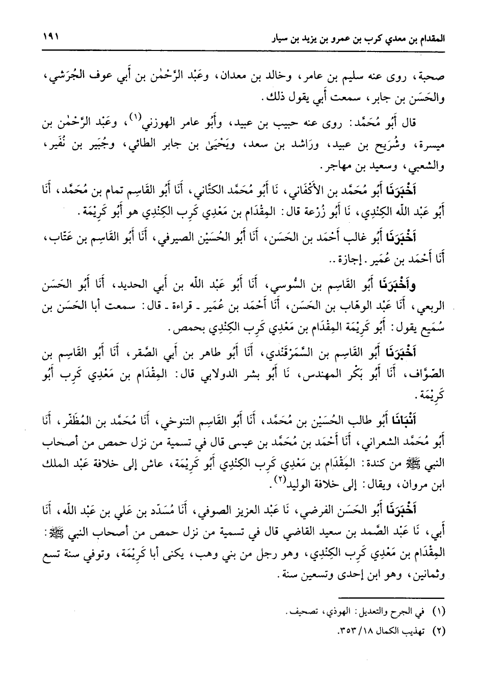 صحبة روى عنه سليم بن عامر وخالد بن معدان وعبد الرحمن بن أبي عوف الجرشي والحسن بن جابر سمعت ابي يقول ذلك قال أبو محمد روى عنه حبيب بن عبيد وابو عامر الهوزني (1) وعبد الرحمن بن ميسرة وشريح بن عبيد وراشد بن سعد ويحيى بن جابر الطائي وجبير بن نفير والشعبي وسعيد بن مهاجر أخبرنا أبو محمد بن الأكفاني نا أبو محمد الكتاني أنا أبو القاسم تمام بن محمد أنا أبو عبد الله الكندي نا أبو زرعة قال المقدام بن معدي كرب الكندي هو أبو كريمة أخبرنا أبو غالب أحمد بن الحسن أنا أبو الحسين الصيرفي أنا أبو القاسم بن عتاب أنا أحمد بن عمير إجازة وأخبرنا أبو القاسم بن السوسي أنا أبو عبد الله بن أبي الحديد أنا أبو الحسن الربعي أنا عبد الوهاب بن الحسن أنا أحمد بن عمير قراءة قال سمعت أبا الحسن بن سميع يقول أبو كريمة المقدام بن معدي كرب الكندي بحمص أخبرنا أبو القاسم بن السمرقندي أنا أبو طاهر بن أبي الصقر أنا أبو القاسم بن الصواف أنا أبو بكر المهندس نا أبو بشر الدولابي قال المقدام بن معدي كرب أبو كريمة أنبأنا أبو طالب الحسين بن محمد أنا أبو القاسم التنوخي أنا محمد بن المظفر أنا أبو محمد الشعراني أنا أحمد بن محمد بن عيسى قال في تسمية من نزل حمص من أصحاب النبي (صلى الله عليه وسلم) من كندة المقدام بن معدي كرب الكندي أبو كريمة عاش إلى خلافة عبد الملك ابن مروان ويقال إلى خلافة الوليد (2) أخبرنا أبو الحسن الفرضي نا عبد العزيز الصوفي أنا مسدد بن علي بن عبد الله أنا أبي نا عبد الصمد بن سعيد القاضي قال في تسمية من نزل حمص من أصحاب النبي (صلى الله عليه وسلم) المقدام بن معدي كرب الكندي وهو رجل من بني وهب يكنى ابا كريمة وتوفي سنة تسع وثمانين وهو ابن إحدى وتسعين سنة