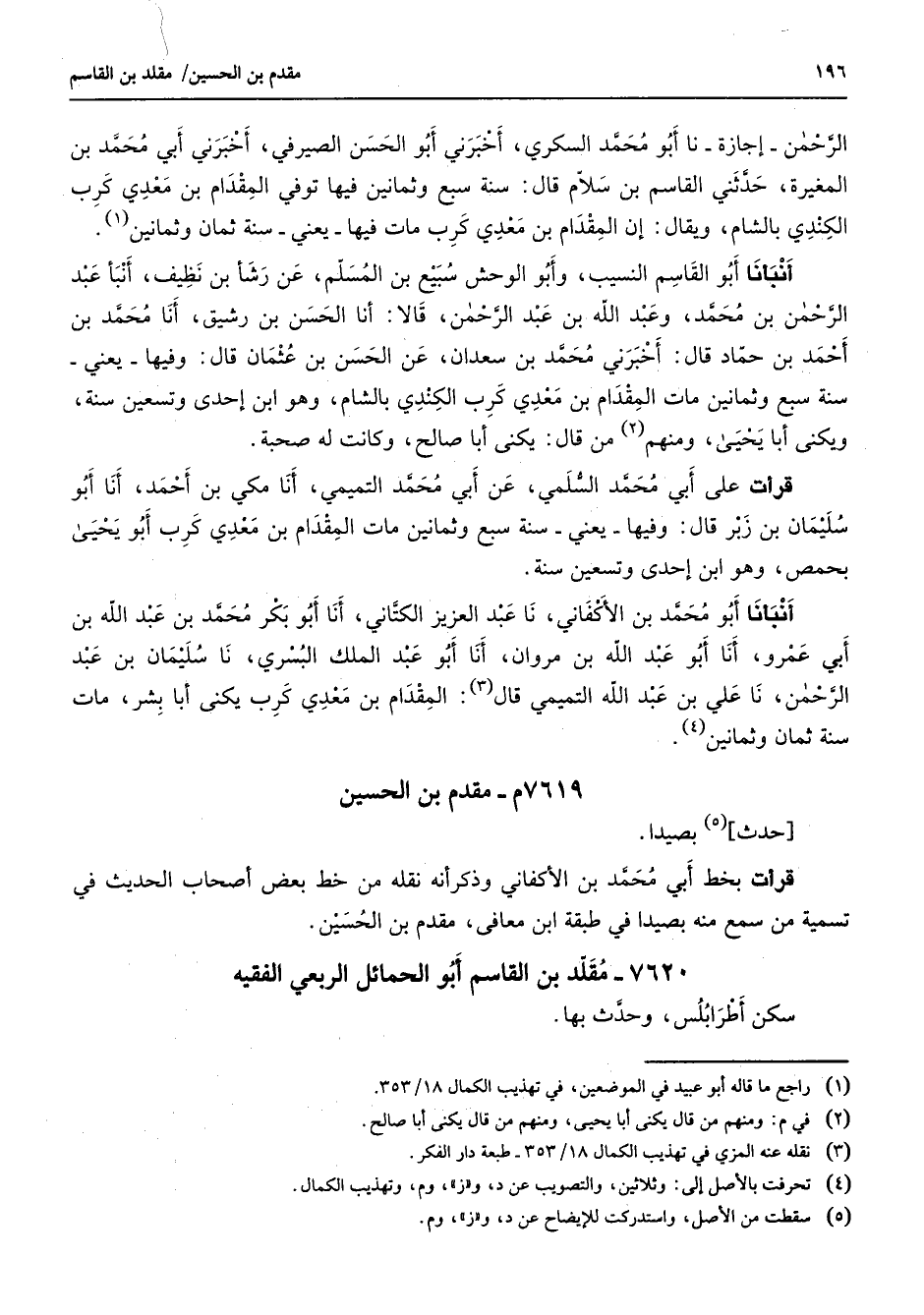 7619 - م مقدم بن الحسين حدث (5) بصيدا قرأت بخط أبي محمد بن الأكفاني وذكر أنه نقله من خط بعض أصحاب الحديث في تسمية من سمع منه بصيدا في طبقة ابن معافى مقدم بن الحسين 7620 - مقلد بن القاسم أبو الحمائل الربعي الفقيه سكن أطرابلس وحدث بها