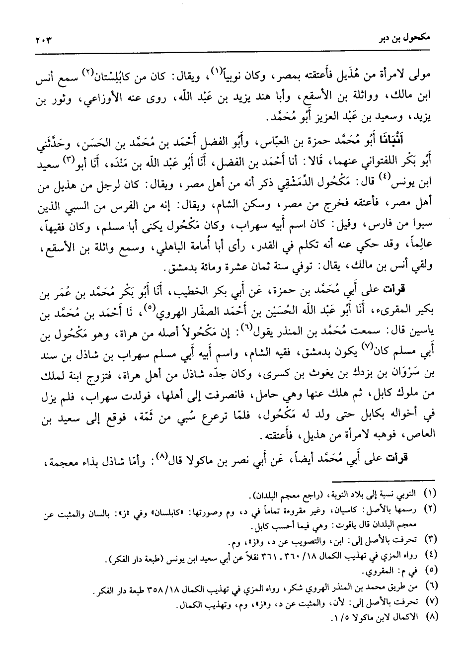 مولى لامرأة من هذيل فأعتقته بمصر وكان نوبيا (1) ويقال كان من كابلستان (2) سمع أنس ابن مالك وواثلة بن الأسقع وأبا هند يزيد بن عبد الله روى عنه الأوزاعي وثور بن يزيد وسعيد بن عبد العزيز أبو محمد أنبأنا أبو محمد حمزة بن العباس وأبو الفضل أحمد بن محمد بن الحسن وحدثني أبو بكر اللفتواني عنهما قالا أنا أحمد بن الفضل أنا أبو عبد الله بن مندة أنا أبو (3) سعيد ابن يونس (4) قال مكحول الدمشقي ذكر أنه من أهل مصر ويقال كان لرجل من هذيل من أهل مصر فأعتقه فخرج من مصر وسكن الشام ويقال إنه من الفرس من السبي الذين سبوا من فارس وقيل كان اسم أبيه سهراب وكان مكحول يكنى أبا مسلم وكان فقيها عالما وقد حكي عنه أنه تكلم في القدر رأى أبا أمامة الباهلي وسمع واثلة بن لأسقع ولقي أنس بن مالك يقال توفي سنة ثمان عشرة ومائة بدمشق قرأت على أبي محمد بن حمزة عن أبي بكر الخطيب أنا أبو بكر محمد بن عمر بن بكير المقرئ أنا أبو عبد الله الحسين بن أحمد الصفار الهروي (5) نا أحمد بن محمد بن ياسين قال سمعت محمد بن المنذر يقول (6) إن مكحولا أصله من هراة وهو مكحول بن أبي مسلم كان (7) يكون بدمشق فقيه الشام واسم أبيه أبي مسلم سهراب بن شاذل بن سند بن سروان بن بزدك بن يغوث بن كسرى وكان جده شاذل من أهل هراة فتزوج ابنة لملك من ملوك كابل ثم هلك عنها وهي حامل فانصرفت إلى أهلها فولدت سهراب فلم يزل في أخواله بكابل حتى ولد له مكحول فلما ترعرع سبي من ثمة فوقع إلى سعيد بن العاص فوهبه لامرأة من هذيل فأعتقته قرأت على أبي محمد أيضا عن أبي نصر بن ماكولا قال (8) وأما شاذل بذاء معجمة