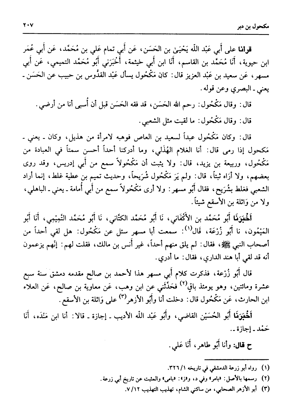 قرأنا على أبي عبد الله يحيى بن الحسن عن أبي تمام علي بن محمد عن أبي عمر ابن حيوية أنا محمد بن القاسم أنا ابن أبي خيثمة أخبرني أبو محمد التميمي عن أبي مسهر عن سعيد بن عبد العزيز قال كان مكحول يسأل عبد القدوس بن حبيب عن الحسن يعني البصري وعن قوله قال وقال مكحول رحم الله الحسن قد فقه الحسن قبل أن أسبى أنا من أرضي قال وقال مكحول ما لقيت مثل الشعبي قال وكان مكحول عبدا لسعيد بن العاص فوهبه لامرأة من هذيل وكان يعني مكحول إذا رمى قال أنا الغلام الهذلي وما أدركنا أحدا أحسن سمتا في العبادة من مكحول وربيعة بن يزيد قال ولا يثبت أن مكحولا سمع من أبي إدريس وقد روى بعضهم ولا أراه ثبتا قال ولم ير مكحول شريحا وحديث تميم بن عطية غلط إنما أراد الشعبي فغلط بشريح فقال أبو مسهر ولا أرى مكحولا سمع من أبي أمامة يعني الباهلي ولا من واثلة بن الأسقع شيئا أخبرنا أبو محمد بن الأكفاني نا أبو محمد الكتاني نا أبو محمد التميمي أنا أبو الميمون نا أبو زرعة قال (1) سمعت أبا مسهر سئل عن مكحول هل لقي أحدا من أصحاب النبي (صلى الله عليه وسلم) فقال لم يلق منهم أحدا غير أنس بن مالك فقلت لهم إنهم يزعمون أنه قد لقي أبا هند الداري فقال ما أدري قال أبو زرعة فذكرت كلام أبي مسهر هذا لأحمد بن صالح مقدمه دمشق سنة سبع عشرة ومائتين وهو يومئذ باق (2) فحدثني عن ابن وهب عن معاوية بن صالح عن العلاء ابن الحارث عن مكحول قال دخلت أنا وأبو الأزهر (3) على واثلة بن الأسقع أخبرنا أبو الحسين القاضي وأبو عبد الله الأديب إجازة قالا أنا ابن مندة أنا حمد إجازة ح قال وأنا أبو طاهر أنا علي