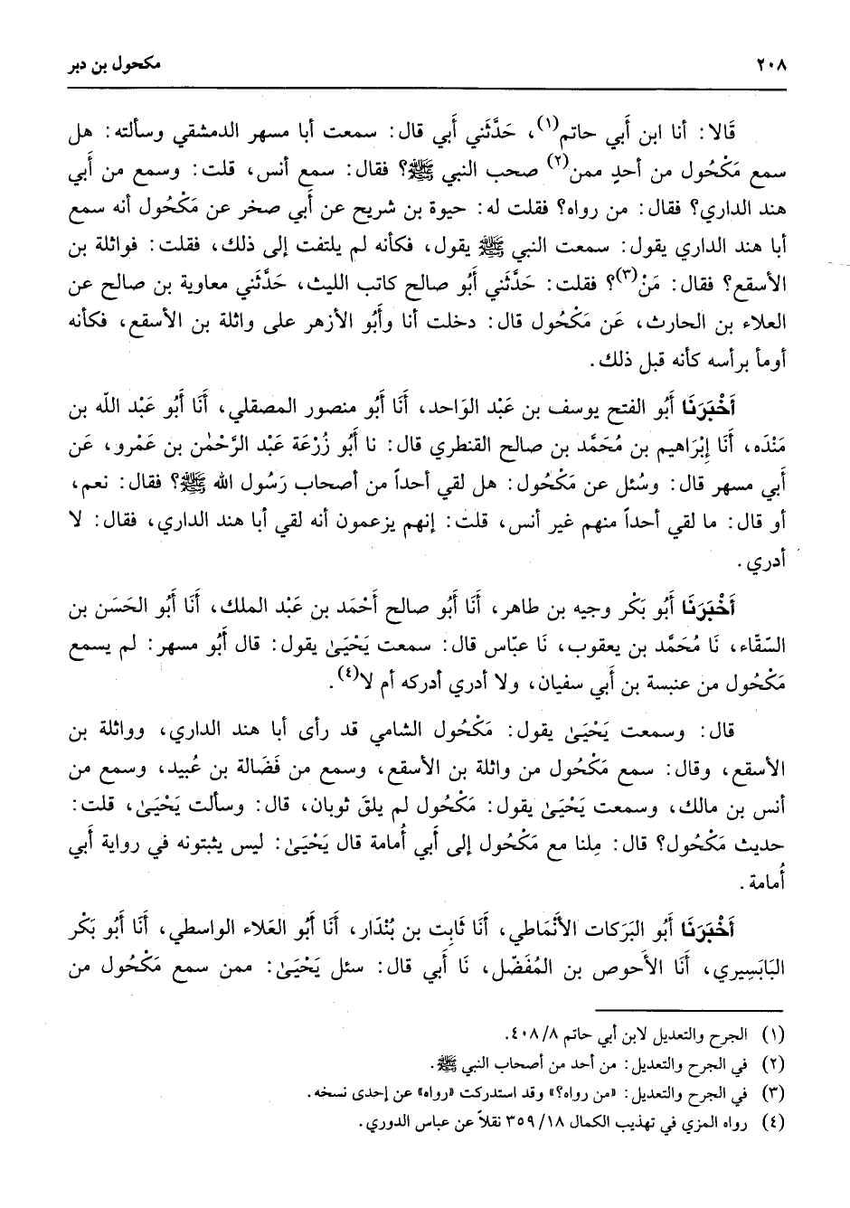 قالا أنا ابن أبي حاتم (1) حدثني أبي قال سمعت أبا مسهر الدمشقي وسألته هل سمع مكحول من أحد ممن (2) صحب النبي (صلى الله عليه وسلم) فقال سمع أنس قلت وسمع من أبي هند الداري فقال من رواه فقلت له حيوة بن شريح عن أبي صخر عن مكحول أنه سمع أبا هند الداري يقول سمعت النبي (صلى الله عليه وسلم) يقول فكأنه لم يلتفت إلى ذلك فقلت فواثلة بن الأسقع فقال من (3) فقلت حدثني أبو صالح كاتب الليث حدثني معاوية بن صالح عن العلاء بن الحارث عن مكحول قال دخلت أنا وأبو الأزهر على واثلة بن الأسقع فكأنه أومأ برأسه كأنه قبل ذلك أخبرنا أبو الفتح يوس بن عبد الواحد أنا أبو منصور المصقلي أنا أبو عبد الله بن مندة أنا إبراهيم بن محمد بن صالح القنطري قال نا أبو زرعة عبد الرحمن بن عمرو عن أبي مسهر قال وسئل عن مكحول هل لقي أحدا من أصحاب رسول الله (صلى الله عليه وسلم) فقال نعم أو قال ما لقي أحدا منهم غير أنس قلت إنهم يزعمون أنه لقي أبا هند الداري فقال لا أدري أخبرنا أبو بكر وجيه بن طاهر أنا أبو صالح أحمد بن عبد الملك أنا أبو الحسن بن السقاء نا محمد بن يعقوب نا عباس قال سمعت يحيى يقول قال أبو مسهر لم يسمع مكحول من عنبسة بن أبي سفيان ولا أدري أدركه أم لا (4) قال وسمعت يحيى يقول مكحول الشامي قد رأى أبا هند الداري وواثلة بن الأسقع وقال سمع مكحول من واثلة بن الأسقع وسمع من فضالة بن عبيد وسمع من أنس بن مالك وسمعت يحيى يقول مكحول لم يلق ثوبان قال وسألت يحيى قلت حديث مكحول قال ملنا مع مكحول إلى أبي أمامة قال يحيى ليس يثبتونه في رواية أبي أمامة أخبرنا أبو البركات الأنماطي أنا ثابت بن بندار أنا أبو العلاء الواسطي أنا أبو بكر البابسيري أنا الأحوص بن المفضل نا أبي قال سئل يحيى ممن سمع مكحول من