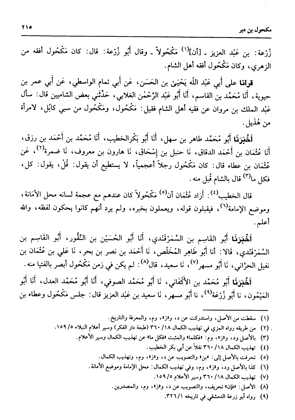زرعة بن عبد العزيز أن (1) مكحولا وقال أبو زرعة قال كان مكحول أفقه من الزهري وكان مكحول أفقه أهل الشام قرأنا على أبي عبد الله يحيى بن الحسن عن أبي تمام الواسطي عن أبي عمر بن حيوية أنا محمد بن القاسم أنا أبو عبد الرحمن الغلابي حدثني بعض الشاميين قال سأل عبد الملك بن مروان عن فقيه أهل الشام فقيل مكحول ومكحول من سبي كابل لامرأة من هذيل أخبرنا أبو محمد طاهر بن سهل أنا أبو بكر الخطيب أنا محمد بن أحمد بن رزق أنا عثمان بن أحمد الدقاق نا حنبل بن إسحاق نا هارون بن معروف نا ضمرة (2) عن عثمان بن عطاء قال كان مكحول رجلا أعجميا لا يستطيع أن يقول قل يقول كل فكل ما (3) قال بالشام قبل منه قال الخطيب (4) أراد عثمان (5) أن مكحولا كان عندهم مع عجمة لسانه محل الأمانة وموضع الإمامة (6) فيقبلون قوله ويعملون بخبره ولم يرد أنهم كانوا يحكون لفظه والله أعلم أخبرنا أبو القاسم بن السمرقندي أنا أبو الحسين بن النقور أبو القاسم بن السمرقندي قالا أنا أبو طاهر المخلص نا أحمد بن نصر بن بحر نا علي بن عثمان بن نفيل الحراني نا أبو مسهر (7) نا سعيد قال (8) لم يكن في زمن مكحول أبصر بالفتيا منه أخبرنا أبو محمد بن الأكفاني نا أبو محمد الصوفي أنا أبو محمد العدل أنا أبو الميمون نا أبو زرعة (9) نا أبو مسهر نا سعيد بن عبد العزيز قال جلس مكحول وعطاء بن