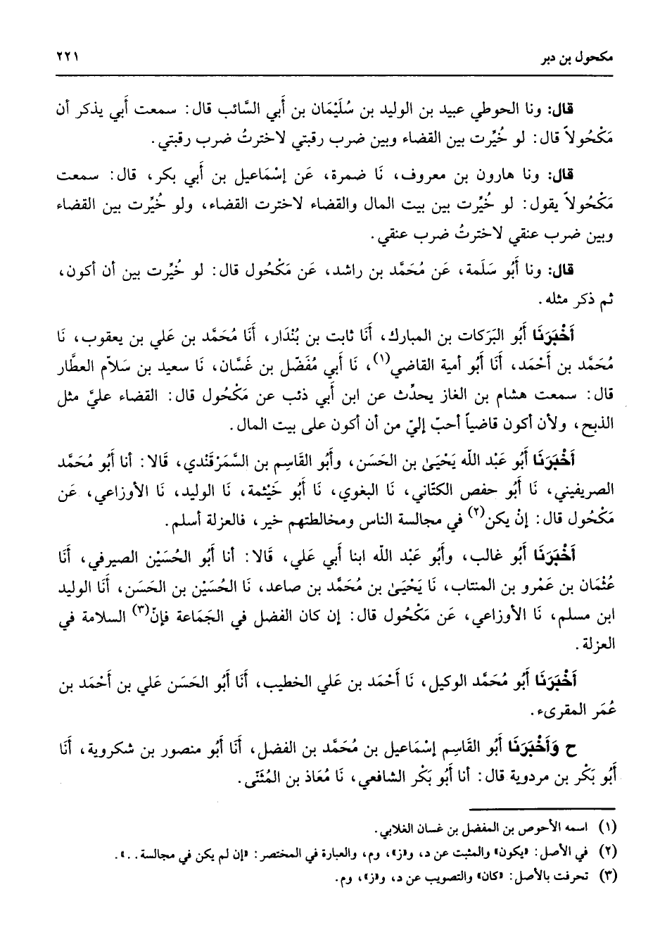 قال ونا الحوطي عبيد بن الوليد بن سليمان بن أبي السائب قال سمعت أبي يذكر أن مكحولا قال لو خيرت بين القضاء وبين ضرب رقبتي لاخترت ضرب رقبتي قال ونا هارون بن معروف نا ضمرة عن إسماعيل بن أبي بكر قال سمعت مكحولا يقول لو خيرت بين بيت المال والقضاء لاخترت القضاء ولو خيرت بين القضاء وبين ضرب عنقي لاخترت ضرب عنقي قال ونا أبو سلمة عن محمد بن راشد عن مكحول قال لو خيرت بين أن أكون ثم ذكر مثله أخبرنا أبو البركات بن المبارك أنا ثابت بن بندار أنا محمد بن علي بن يعقوب نا محمد بن أحمد أنا أبو أمية القاضي (1) نا أبي مفضل بن غسان نا سعيد بن سلام العطار قال سمعت هشام بن الغاز يحدث عن ابن أبي ذئب عن مكحول قال القضاء علي مثل الذبح ولأن أكون قاضيا أحب إلي من أن أكون على بيت المال أخبرنا أبو عبد الله يحيى بن الحسن وأبو القاسم بن السمرقندي قالا أنا أبو محمد الصريفيني نا أبو حفص الكتاني نا البغوي نا أبو خيثمة نا الوليد نا الأوزاعي عن مكحول قال إن يكن (2) في مجالسة الناس ومخالطتهم خير فالعزلة أسلم أخبرنا أبو غالب وأبو عبد الله ابنا أبي علي قالا أنا أبو الحسين الصيرفي أنا عثمان بن عمرو بن المنتاب نا يحيى بن محمد بن صاعد نا الحسين بن الحسن أنا الوليد ابن مسلم نا الأوزاعي عن مكحول قال إن كان الفضل في الجماعة فإن (3) السلامة في العزلة أخبرنا أبو محمد الوكيل نا أحمد بن علي الخطيب أنا أبو الحسن علي بن أحمد بن عمر المقرئ ح وأخبرنا أبو القاسم إسماعيل بن محمد بن الفضل أنا أبو منصور بن شكروية أنا أبو بكر بن مردوية قال أنا أبو بكر الشافعي نا معاذ بن المثنى