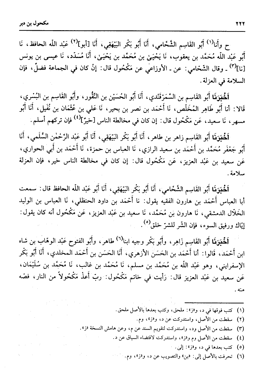 ح وأنا (1) أبو القاسم الشحامي أنا أبو بكر البيهقي أنا أبو (2) عبد الله الحافظ نا أبو عبد الله محمد بن يعقوب نا يحيى بن محمد بن يحيى أنا مسدد نا عيسى بن يونس نا (3) وقال الشحامي عن الأوزاعي عن مكحول قال إن كان في الجماعة فضل فإن السلامة في العزلة أخبرنا أبو القاسم بن السمرقندي أنا الحسين بن النقور وأبو القاسم بن البسري قالا أنا أبو طاهر المخلص نا أحمد بن نصر بن بحير نا علي بن عثمان بن نفيل أنا أبو مسهر نا سعيد عن مكحول قال إن كان في مخالطة الناس خير (4) فإن تركهم أسلم أخبرنا أبو القاسم زاهر بن طاهر أنا أبو بكر البيهقي أنا أبو عبد الرحمن السلمي أنا أبو جعفر محمد بن أحمد بن سعيد الرازي نا العباس بن حمزة نا أحمد بن أبي الحواري عن سعيد بن عبد العزيز عن مكحول قال إن كان في مخالطة الناس خير فإن العزلة سلامة أخبرنا أبو القاسم الشحامي أنا أبو بكر البيهقي أنا أبو عبد الله الحافظ قال سمعت أبا العباس أحمد بن هارون الفقيه يقول نا أحمد بن داود الحنظلي نا العباس بن الوليد الخلال الدمشقي نا هارون بن محمد نا سعيد بن عبد العزيز عن مكحول أنه كان يقول إياك ورفيق السوء فإن الشر للشر خلق (5) أخبرنا أبو القاسم زاهر وأبو بكر وجيه ابنا (6) طاهر وأبو الفتوح عبد الوهاب بن شاه ابن أحمد قالوا أنا أحمد بن الحسن الأزهري أنا الحسن بن أحمد المخلدي أنا أبو بكر الإسفرايني وهو عبد الله بن محمد بن مسلم نا محمد بن غالب نا محمد بن سليمان عن سعيد بن عبد العزيز قال رأيت في خاتم مكحول رب أعذ مكحولا من النار فصه منه