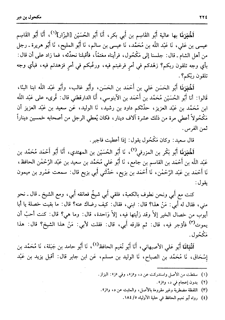أخبرنا بها عالية أبو القاسم بن أبي بكر أنا أبو الحسين البزار (1) أنا أبو القاسم عيسى بن علي نا عبد الله بن محمد نا عيسى بن سالم نا أبو المليح نا أبو هريرة رجل من أهل الشام قال جلسنا إلى مكحول فرأيناه مغتما فأقبلنا نحدثه فما زاد على أن قال بأي وجه تلقون ربكم زهدكم في أمر فرغبتم فيه ورغبكم في أمر فزهدتم فيه فبأي وجه تلقون ربكم أخبرنا أبو الحسن علي بن أحمد بن الحسن وأبو غالب وأبو عبد الله ابنا البنا قالوا أنا أبو الحسين محمد بن أحمد بن الآبنوسي أنا الدارقطني قال قرئ على عبد الله ابن محمد بن عبد العزيز حدثكم داود بن رشيد نا الوليد عن سعيد بن عبد العزيز أن مكحولا أعطي مرة من ذلك عشرة آلاف دينار فكان يعطي الرجل من أصحابه خمسين دينارا ثمن الفرس قال سعيد وكان مكحول يقول إذا أعطيت فاجبر أخبرنا أبو بكر بن المزرفي (2) نا أبو الحسين بن المهتدي أنا أبو أحمد محمد بن عبد الله بن أحمد بن القاسم بن جامع نا أبو علي محمد بن سعيد بن عبد الرحمن الحافظ نا أحمد بن عبد الرحمن نا أحمد بن بزيع حدثني أبي بزيع قال سمعت عمرو بن ميمون يقول كنت مع أبي ونحن نطوف بالكعبة فلقي أبي شيخ فعانقه أبي ومع الشيخ قال نحو مني فقال له أبي من هذا قال ابني فقال كيف رضاك عنه قال ما بقيت خصلة يا أبا أيوب من خصال الخير إلا وقد رأيتها فيه إلا واحدة قال وما هي قال كنت أحب أن يموت (3) فأؤجر فيه قال ثم فارقه أبي قال فقلت لأبي من هذا الشيخ قال هذا مكحول