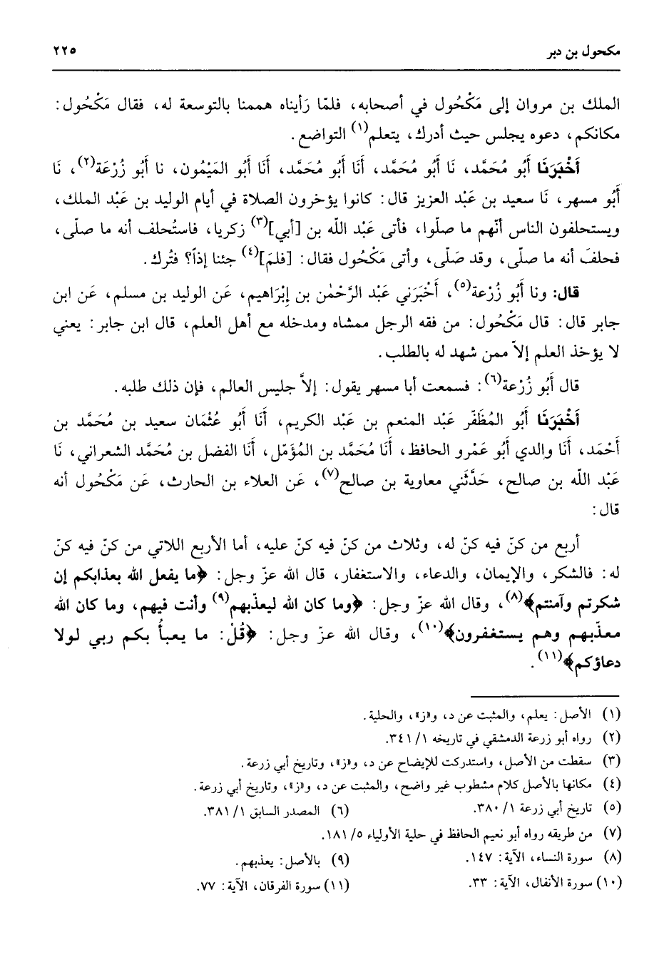 الملك بن مروان إلى مكحول في أصحابه فلما رأيناه هممنا بالتوسعة له فقال مكحول مكانكم دعوه يجلس حيث أدرك يتعلم (1) التواضع أخبرنا أبو محمد نا أبو محمد أنا أبو محمد أنا أبو الميمون نا أبو زرعة (2) نا أبو مسهر نا سعيد بن عبد العزيز قال كانوا يؤخرون الصلاة في أيام الوليد بن عبد الملك ويستحلفون الناس أنهم ما صلوا فأتى عبد الله بن أبي (3) زكريا فاستحلف أنه ما صلى فحلف أنه ما صلى وقد صلى وأتى مكحول فقال فلم (4) جئنا إذا فترك قال ونا أبو زرعة (5) أخبرني عبد الرحمن بن إبراهيم عن الوليد بن مسلم عن ابن جابر قال قال مكحول من فقه الرجل ممشاه ومدخله مع أهل العلم قال ابن جابر يعني لا يؤخذ العلم إلا ممن شهد له بالطلب قال أبو زرعة (6) فسمعت أبا مسهر يقول إلا جليس العالم فإن ذلك طلبه أخبرنا أبو المظفر عبد المنعم بن عبد الكريم أنا أبو عثمان سعيد بن محمد بن أحمد أنا والدي أبو عمرو الحافظ أنا محمد بن المؤمل أنا الفضل بن محمد الشعراني نا عبد الله بن صالح حدثني معاوية بن صالح (7) عن العلاء بن الحارث عن مكحول أنه قال أربع من كن فيه كن له وثلاث من كن فيه كن عليه أما الأربع اللاتي من كن فيه كن له فالشكر والإيمان والدعاء والاستغفار قال الله عز وجل " ما يفعل الله بعذابكم إن شكرتم وآمنتم " (8) وقال الله عز وجل " وما كان الله ليعذبهم (9) وأنت فيهم وما كان الله معذبهم وهم يستغفرون " (10) وقال الله عز وجل " قل ما يعبأ بكم ربي لولا دعاؤكم " (11)
