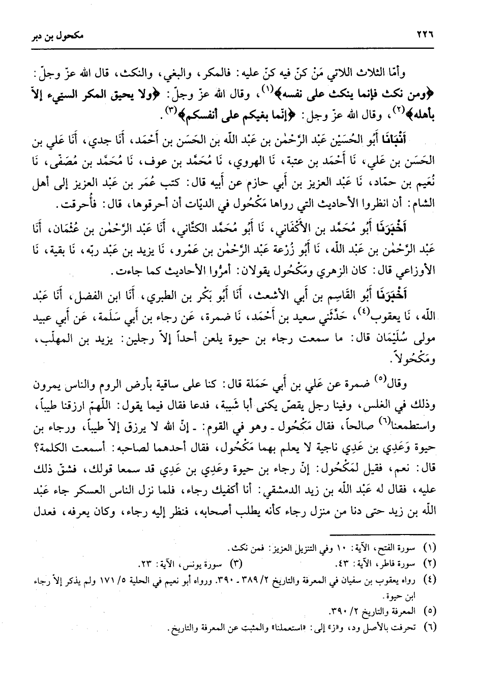 وأما الثلاث اللاتي من كن فيه كن عليه فالمكر والبغي والنكث قال الله عز وجل " ومن نكث فإنما ينكث على نفسه " (1) وقال الله عز وجل " ولا يحيق المكر السيئ إلا بأهله " (2) وقال الله عز وجل " إنما بغيكم على أنفسكم " (3) أنبأنا أبو الحسين عبد الرحمن بن عبد الله بن الحسن بن أحمد أنا جدي أنا علي بن الحسن بن علي نا أحمد بن عتبة نا الهروي نا محمد بن عوف نا محمد بن مصفى نا نعيم بن حماد نا عبد العزيز بن أبي حازم عن أبيه قال كتب عمر بن عبد العزيز إلى أهل الشام أن انظروا الأحاديث التي رواها مكحول في الديات أن أحرقوها قال فأحرقت أخبرنا أبو محمد بن الأكفاني نا أبو محمد الكتاني أنا عبد الرحمن بن عثمان أنا عبد الرحمن بن عبد الله نا أبو زرعة عبد الرحمن بن عمرو نا يزيد بن عبد ربه نا بقية نا الأوزاعي قال كان الزهري ومكحول يقولان أمروا الأحاديث كما جاءت أخبرنا أبو القاسم بن أبي الأشعث أنا أبو بكر بن الطبري أنا ابن الفضل أنا عبد الله نا يعقوب (4) حدثني سعيد بن أحمد نا ضمرة عن رجاء بن أبي سلمة عن أبي عبيد مولى سليمان قال ما سمعت رجاء بن حيوة يلعن أحدا إلا رجلين يزيد بن المهلب ومكحولا وقال (5) ضمرة عن علي بن أبي حملة قال كنا على ساقية بأرض الروم والناس يمرون وذلك في الغلس وفينا رجل يقص يكنى أبا شيبة فدعا فقال فيما يقول اللهم ارزقنا طيبا واستطمعنا (6) صالحا فقال مكحول وهو في القوم إن الله لا يرزق إلا طيبا ورجاء بن حيوة وعدي بن عدي ناجية لا يعلم بهما مكحول فقال أحدهما لصاحبه أسمعت الكلمة قال نعم فقيل لمكحول إن رجاء بن حيوة وعدي بن عدي قد سمعا قولك فشق ذلك عليه فقال له عبد الله بن زيد الدمشقي أنا أكفيك رجاء فلما نزل الناس العسكر جاء عبد الله بن زيد حتى دنا من منزل رجاء كأنه يطلب أصحابه فنظر إليه رجاء وكان يعرفه فعدل