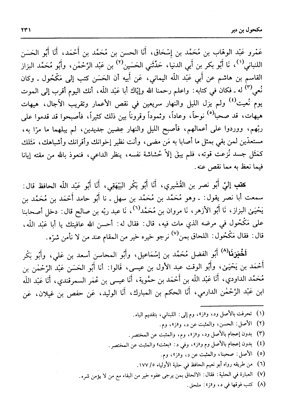 كمثل جسد نزعت قوته فلم يبق إلا حشاشة نفسه ينظر الداعي فنعوذ بالله من مقته إيانا فيما نعظ به مما نقص عنه كتب إلي أبو نصر بن القشيري أنا أبو بكر البيهقي أنا أبو عبد الله الحافظ قال سمعت أبا نصر يقول وهو محمد بن محمد بن يحيى البزار نا أبو الأزهر نا مروان بن محمد (6) نا عبد ربه بن صالح قال دخل أصحابنا على مكحول في مرضه الذي مات فيه قال فقال له أحسن الله عافيتك يا أبا عبد الله قال فقال مكحول اللحاق بمن (7) نرجو خيره من المقام عند من لا نأمن شره أخبرنا (8) أبو الفضل محمد بن إسماعيل وأبو المحاسن أسعد بن علي وأبو بكر أحمد بن يحيى وأبو الوقت عبد الأول بن عيسى قالوا أنا أبو الحسن عبد الرحمن بن محمد الداودي أنا عبد الله بن أحمد بن حموية أنا عيسى بن عمر السمرقندي أنا عبد الله ابن عبد الرحمن الدارمي أنا الحكم بن المبارك أنا الوليد عن حفص بن غيلان عن
