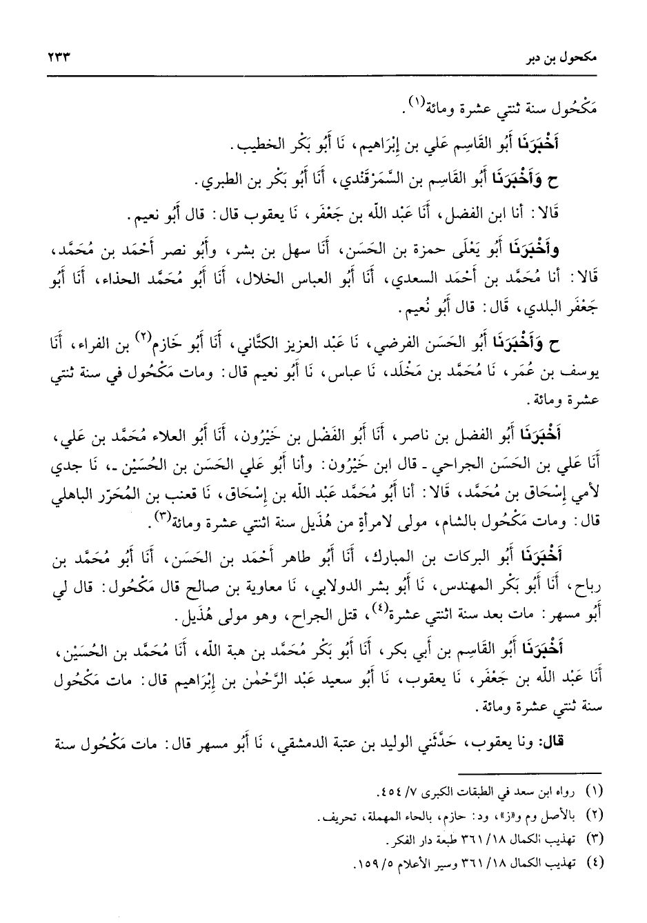 مكحول مكحول سنة ثنتي عشرة ومائة (1) أخبرنا أبو القاسم علي بن إبراهيم نا أبو بكر الخطيب ح وأخبرنا أبو القاسم بن السمرقندي أنا أبو بكر بن الطبري قالا أنا ابن الفضل أنا عبد الله بن جعفر نا يعقوب قال قال أبو نعيم وأخبرنا أبو يعلى حمزة بن الحسن أنا سهل بن بشر وابو نصر أحمد بن محمد قالا أنا محمد بن أحمد السعدي أنا أبو العباس الخلال أنا أبو محمد الحذاء أنا أبو جعفر البلدي قال قال أبو نعيم ح وأخبرنا أبو الحسن الفرضي نا عبد العزيز الكتاني أنا أبو خازم (2) بن الفراء أنا يوسف بن عمر نا محمد بن مخلد نا عباس نا أبو نعيم قال ومات مكحول في سنة ثنتي عشرة ومائة أخبرنا أبو الفضل بن ناصر أنا أبو الفضل بن خيرون أنا أبو العلاء محمد بن علي أنا علي بن الحسن الجراحي قال ابن خيرون وأنا أبو علي الحسن بن الحسين نا جدي لأمي إسحاق بن محمد قالا أنا أبو محمد عبد الله بن إسحاق نا قعنب بن المحرر الباهلي قال ومات مكحول بالشام مولى لامرأة من هذيل سنة اثنتي عشرة ومائة (3)