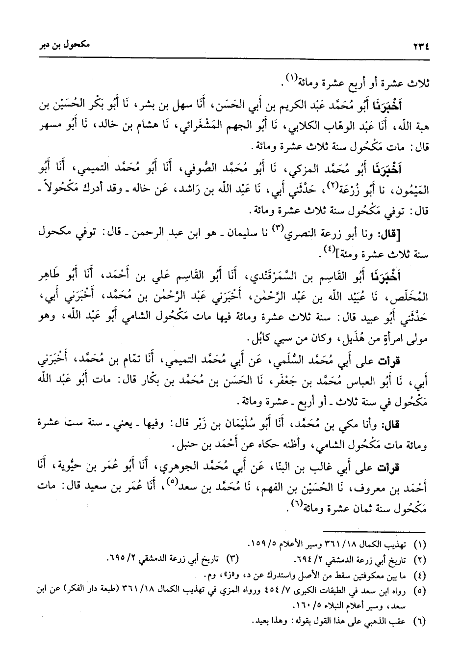 ثلاث عشرة أو أربع عشرة ومائة (1) أخبرنا أبو محمد عبد الكريم بن أبي الحسن أنا سهل بن بشر نا أبو بكر الحسين بن هبة الله أنا عبد الوهاب الكلابي نا أبو الجهم المشغرائي نا هشام بن خالد نا أبو مسهر قال مات مكحول سنة ثلاث عشرة ومائة أخبرنا أبو محمد المزكي نا أبو محمد الصوفي أنا أبو محمد التميمي أنا أبو الميمون نا أبو زرعة (2) حدثني أبي نا عبد الله بن راشد عن خاله وقد أدرك مكحولا قال توفي مكحول سنة ثلاث عشرة ومائة قال ونا أبو زرعة النصري (3) نا سليمان هو ابن عبد الرحمن قال توفي مكحول سنة ثلاث عشرة ومئة (4) أخبرنا أبو القاسم بن السمرقندي أنا أبو القاسم علي بن أحمد أنا أبو طاهر المخلص نا عبيد الله بن عبد الرحمن أخبرني عبد الرحمن بن محمد أخبرني أبي حدثني أبو عبيد قال سنة ثلاث عشرة ومائة فيها مات مكحول الشامي أبو عبد الله وهو مولى امرأة من هذيل وكان من سبي كابل قرأت على ابي محمد السلمي عن أبي محمد التميمي أنا تمام بن محمد أخبرني أبي نا أبو العباس محمد بن جعفر نا الحسن بن محمد بن بكار قال مات أبو عبد الله مكحول في سنة ثلاث أو أربع عشرة ومائة قال وأنا مكي بن محمد أنا أبو سليمان بن زبر قال وفيها يعني سنة ست عشرة ومائة مات مكحول الشامي وأظنه حكاه عن أحمد بن حنبل قرأت على أبي غالب بن البنا عن ابي محمد الجوهري أنا أبو عمر بن حيوية أنا أحمد بن معروف نا الحسين بن الفهم نا محمد بن سعد (5) أنا عمر بن سعيد قال مات مكحول سنة ثمان عشرة ومائة (6)
