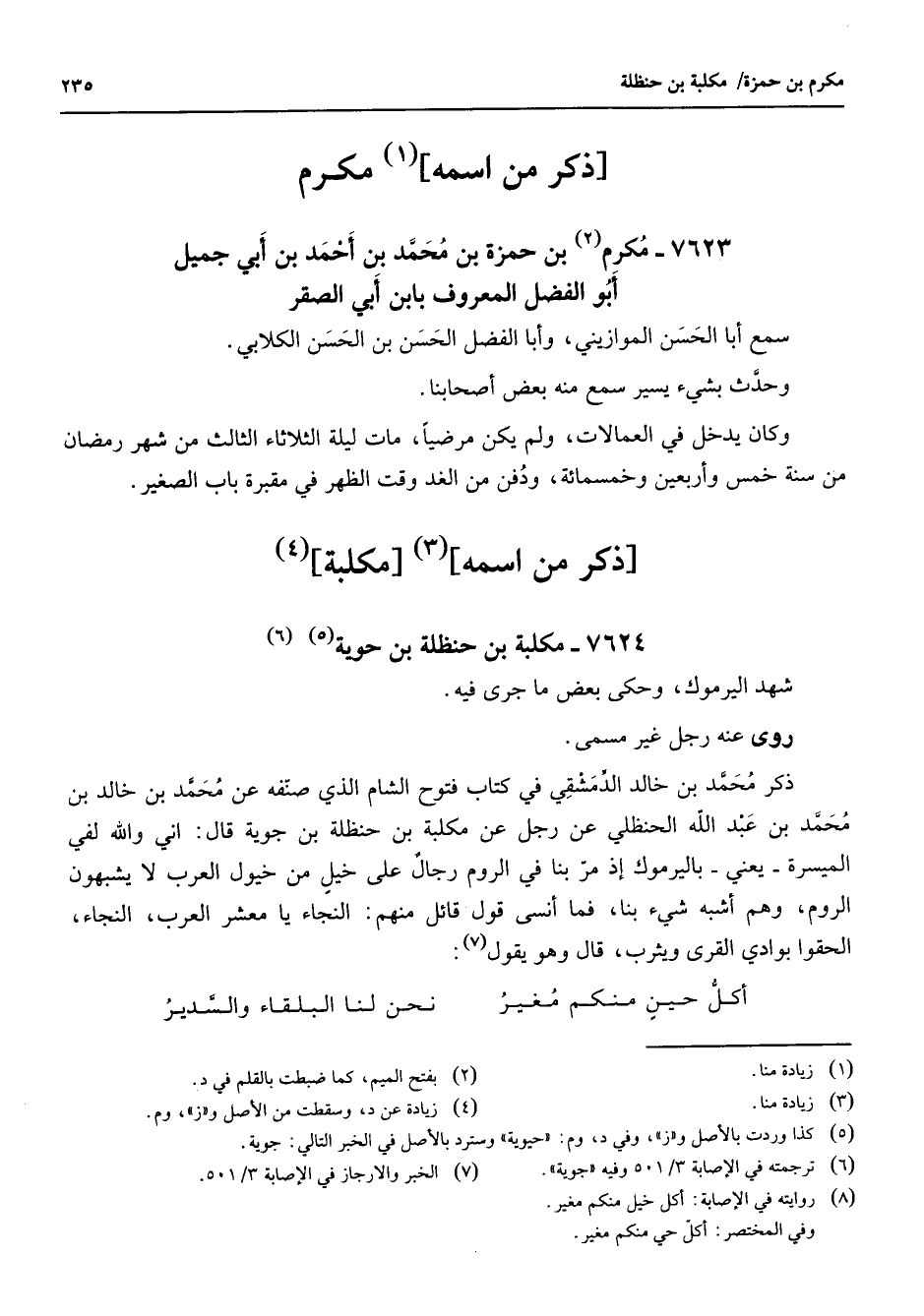 7624 - مكلبة بن حنظلة بن (5) حوية (6) شهد اليرموك وحكى بعض ما جرى فيه روى عنه رجل غير مسمى ذكر محمد بن خالد الدمشقي في كتاب فتوح الشام الذي صنفه عن محمد بن خالد بن محمد بن عبد الله الحنظلي عن رجل عن مكلبة بن حنظلة بن جوية قال إني والله لفي الميسرة يعني باليرموك إذ مر بنا في الروم رجال على خيل من خيول العرب لا يشبهون الروم وهم أشبه شئ بنا فما أنسى قول قائل منهم النجاء يا معشر العرب النجاء الحقوا بوادي القرى ويثرب قال وهو يقول (7) * أكل حين منكم مغير * نحن لنا البلقاء والسدير