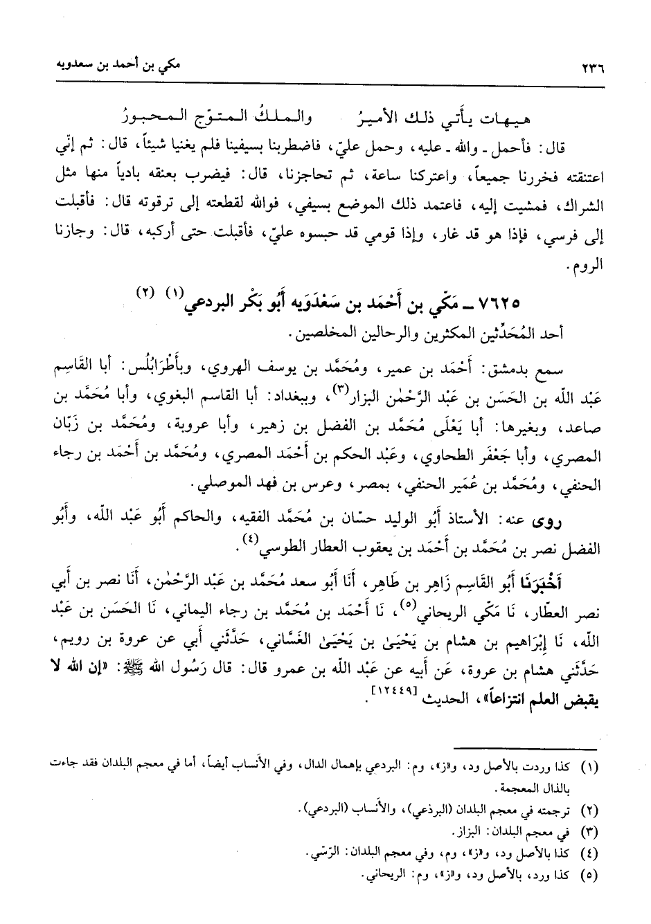 7625 - مكي بن أحمد بن سعدويه أبو بكر البردعي (1) (2) أحد المحدثين المكثرين والرحالين المخلصين سمع بدمشق أحمد بن عمير ومحمد بن يوسف الهروي وبأطرابلس ابا القاسم عبد الله بن الحسن بن عبد الرحمن البزار (3) وببغداد أبا القاسم البغوي وأبا محمد بن صاعد وبغيرها ابا يعلى محمد بن الفضل بن زهير وابا عروبة ومحمد بن زبان المصري وابا جعفر الطحاوي وعبد الحكم بن أحمد المصري ومحمد بن أحمد بن رجاء الحنفي ومحمد بن عمير الحنفي بمصر وعرس بن فهد الموصلي روى عنه الأستاذ أبو الوليد حسان بن محمد الفقيه والحاكم أبو عبد الله وابو الفضل نصر بن محمد بن أحمد بن يعقوب العطار الطوسي (4) أخبرنا أبو القاسم زاهر بن طاهر أنا أبو سعد محمد بن عبد الرحمن أنا نصر بن ابي نصر العطار نا مكي الريحاني (5) نا أحمد بن محمد بن رجاء اليماني نا الحسن بن عبد الله نا إبراهيم بن هشام بن يحيى بن يحيى الغساني حدثني أبي عن عروة بن رويم حدثني هشام بن عروة عن أبيه عن عبد الله بن عمرو قال قال رسول الله (صلى الله عليه وسلم) إن الله لا يقبض العلم انتزاعا