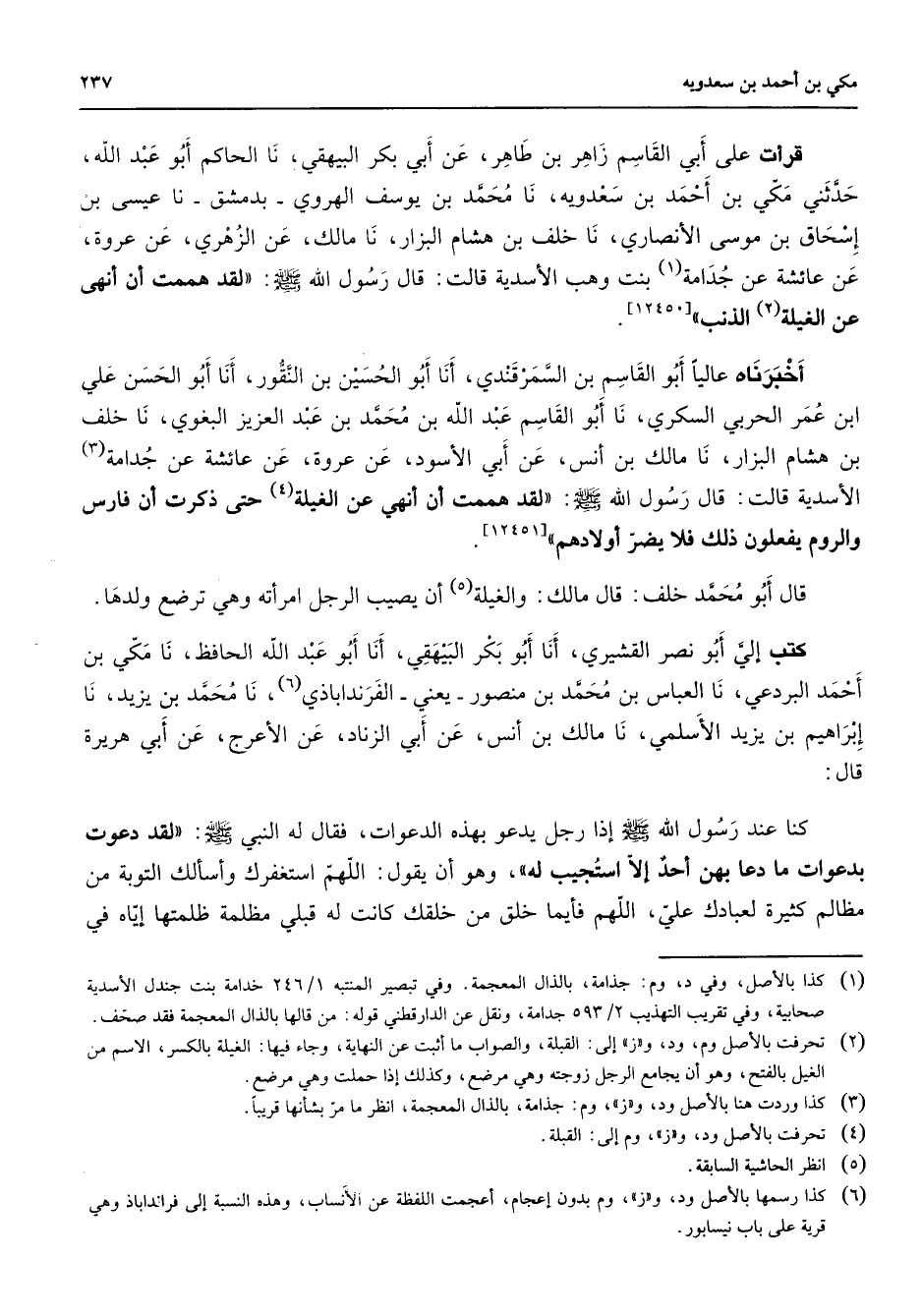 قرات على ابي القاسم زاهر بن طاهر عن أبي بكر البيهقي نا الحاكم أبو عبد الله حدثني مكي بن أحمد بن سعدويه نا محمد بن يوسف الهروي بدمشق نا عيسى بن إسحاق بن موسى الأنصاري نا خلف بن هشام البزار نا مالك عن الزهري عن عروة عن عائشة عن جدامة (1) بنت وهب الأسدية قالت قال رسول الله (صلى الله عليه وسلم) لقد هممت أن أنهى عن الغيلة (2) الذنب