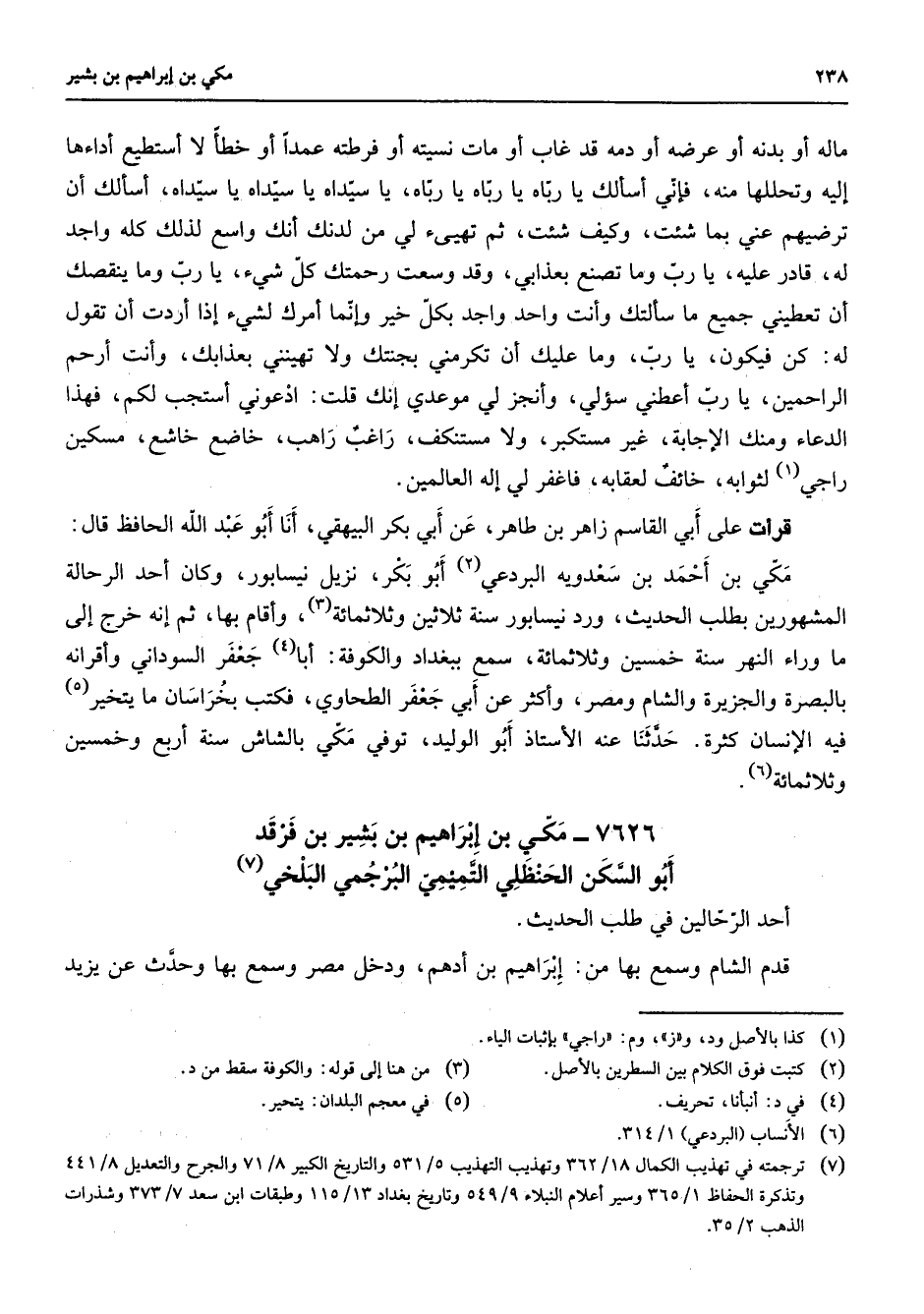 ماله أو بدنه أو عرضه أو دمه قد غاب أو مات نسيته أو فرطته عمدا أو خطأ لا أستطيع أداءها إليه وتحللها منه فإني أسألك يا رباه يا رباه يا رباه يا سيداه يا سيداه يا سيداه أسالك أن ترضيهم عني بما شئت وكيف شئت ثم تهيئ لي من لدنك أنك واسع لذلك كله واجد له قادر عليه يا رب وما تصنع بعذابي وقد وسعت رحمتك كل شئ يا رب وما ينقصك أن تعطيني جميع ما سألتك وأنت واحد واجد بكل خير وإنما أمرك لشئ إذا اردت أن تقول له كن فيكون يا رب وما عليك أن تكرمني بجنتك ولا تهينني بعذابك وأنت أرحم الراحمين يا رب أعطني سؤلي وأنجز لي موعدي إنك قلت ادعوني أستجب لكم فهذا الدعاء ومنك الإجابة غير مستكبر ولا مستنكف راغب راهب خاضع خاشع مسكين راجي (1) لثوابه خائف لعقابه فاغفر لي إله العالمين قرأت على أبي القاسم زاهر بن طاهر عن أبي بكر البيهقي أنا أبو عبد الله الحافظ قال مكي بن أحمد بن سعدويه البردعي (2) أبو بكر نزيل نيسابور وكان أحد الرحالة المشهورين بطلب الحديث ورد نيسابور سنة ثلاثين وثلاثمائة (3) وأقام بها ثم إنه خرج إلى ما وراء النهر سنة خمسين وثلاثمائة سمع ببغداد والكوفة أبا (4) جعفر السوداني وأقرانه بالبصرة والجزيرة والشام ومصر وأكثر عن أبي جعفر الطحاوي فكتب بخراسان ما يتخير (5) فيه الإنسان كثرة حدثنا عنه الأستاذ أبو الوليد توفي مكي بالشاش سنة أربع وخمسين وثلاثمائة (6)