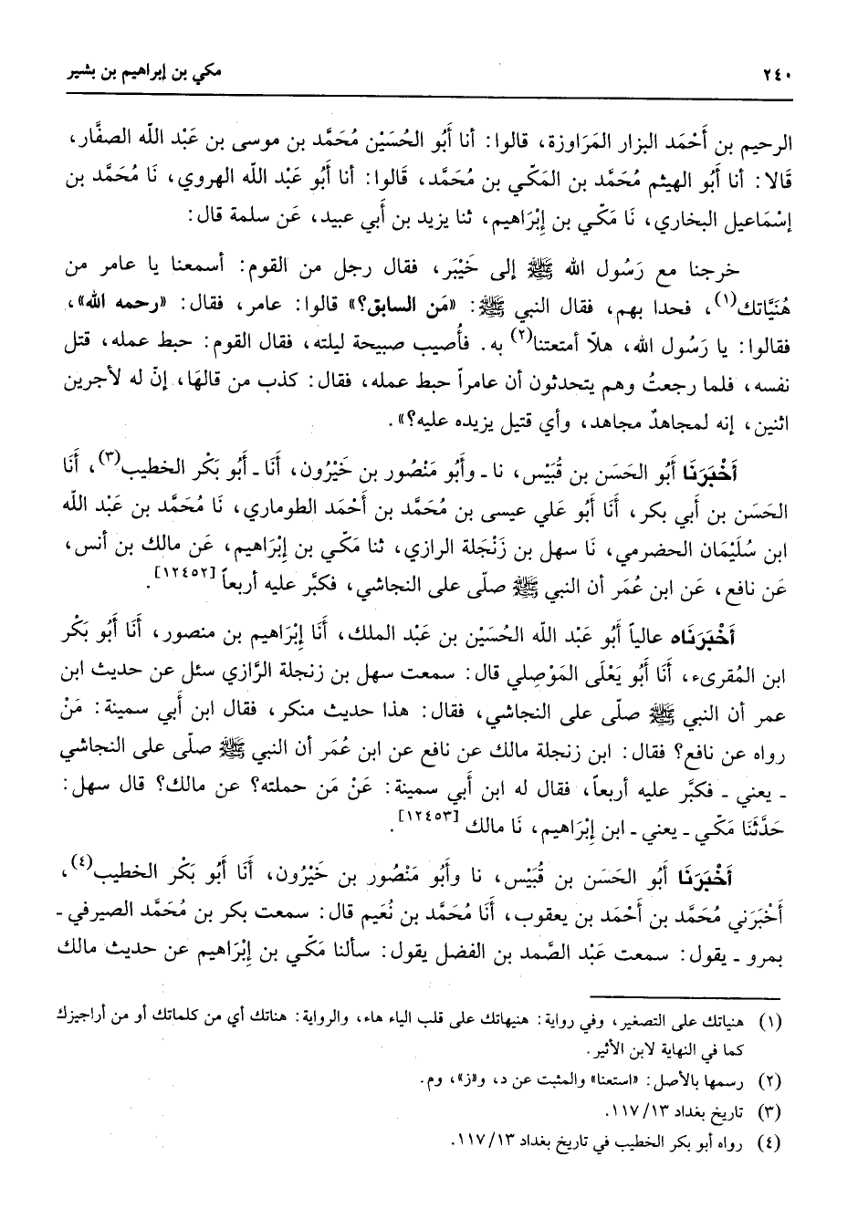 الرحيم بن أحمد البزار المراوزة قالوا أنا أبو الحسين محمد بن موسى بن عبد الله الصفار قالا أنا أبو الهيثم محمد بن المكي بن محمد قالوا أنا أبو عبد الله الهروي نا محمد بن إسماعيل البخاري نا مكي بن إبراهيم ثنا يزيد بن ابي عبيد عن سلمة قال خرجنا مع رسول الله (صلى الله عليه وسلم) إلى خيبر فقال رجل من القوم أسمعنا يا عامر من هنياتك (1) فحدا بهم فقال النبي (صلى الله عليه وسلم) من السابق قالوا عامر فقال رحمه الله فقالوا يا رسول الله هلا أمتعتنا (2) به فأصيب صبيحة ليلته فقال القوم حبط عمله قتل نفسه فلما رجعت وهم يتحدثون أن عامرا حبط عمله فقال كذب من قالها إن له لأجرين اثنين إنه لمجاهد مجاهد واي قتيل يزيده عليه أخبرنا أبو الحسن بن قبيس نا وابو منصور بن خيرون أنا أبو بكر الخطيب (3) أنا الحسن بن أبي بكر أنا أبو علي عيسى بن محمد بن أحمد الطوماري نا محمد بن عبد الله ابن سليمان الحضرمي نا سهل بن زنجلة الرازي ثنا مكي بن إبراهيم عن مالك بن أنس عن نافع عن ابن عمر أن النبي (صلى الله عليه وسلم) صلى على النجاشي فكبر عليها أربعا