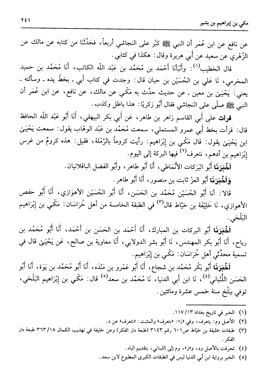 عن نافع عن ابن عمر أن النبي (صلى الله عليه وسلم) كبر على النجاشي اربعا فحدثنا من كتابه عن مالك عن الزهري عن سعيد عن أبي هريرة وقال هكذا في كتابي قال الخطب (1) وأنبأنا أحمد بن محمد بن عبد الله الكاتب أنا محمد بن حميد المخرمي نا علي بن الحسين بن حبان قال وجدت في كتاب أبي بخط يده وسألته يعني يحيى بن معين عن حديث حدث به مكي عن مالك عن نافع عن ابن عمر أن النبي (صلى الله عليه وسلم) صلى على النجاشي فقال أبو زكريا هذا باطل وكذب قرأت على أبي القاسم زاهر بن طاهر عن أبي بكر البيهقي أنا أبو عبد الله الحافظ قال قرأت بخط أبي عمرو المستملي سمعت محمد بن عبد الوهاب يقول سمعت يحيى ابن يحيى يقول قال مكي بن إبراهيم رأيت كروما بالرملة فقيل هذه كروم من غرس إبراهيم بن أدهم نتعرف (2) فيها البركة إلى اليوم أخبرنا أبو البركات الأنماطي أنا أبو طاهر وأبو الفضل الباقلانيان وأخبرنا أبو العز ثابت بن منصور أنا أبو طاهر قالا أنا أبو الحسين محمد بن الحسن أنا أبو الحسين الأهوازي أنا أبو حفص الأهوازي نا خليفة بن خياط قال (3) في الطبقة الخامسة من اهل خراسان مكي بن إبراهيم البلخي أخبرنا أبو البركات بن المبارك أنا أحمد بن الحسن بن أحمد أنا أبو محمد بن رباح أنا أبو بكر المهندس نا أبو بشر الدولابي أنا معاوية بن صالح عن يحيى قال في تسمية محدثي أهل خراسان مكي بن إبراهيم أخبرنا أبو بكر محمد بن شجاع أنا أبو عمر بن مندة أنا أبو محمد بن يوة أنا أبو الحسن اللنباني (4) نا ابن أبي الدنيا نا محمد بن سعد (5) قال مكي بن إبراهيم البلخي توفي ببلخ سنة خمس عشرة ومائتين