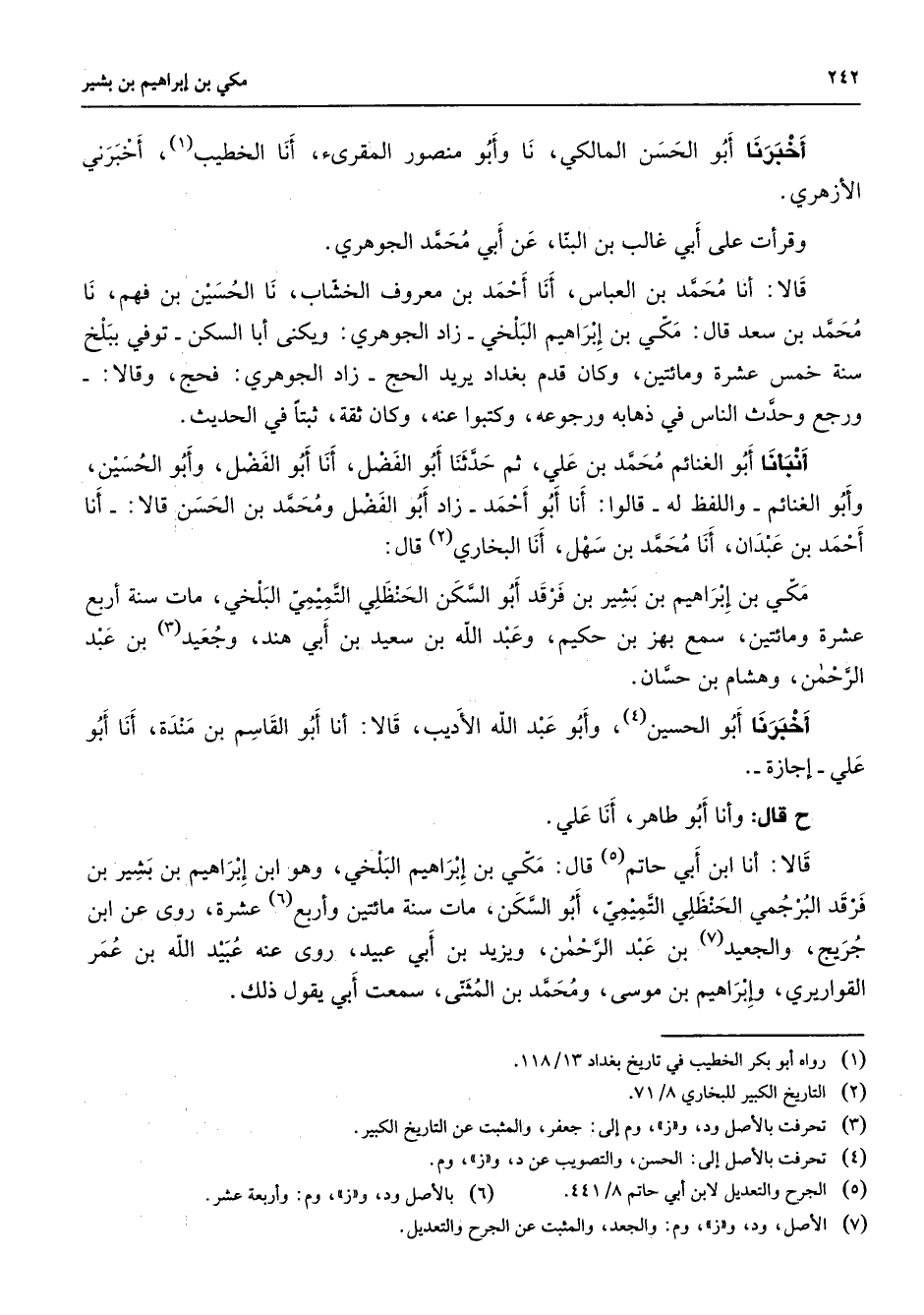 أخبرنا أبو الحسن المالكي نا وابو منصور المقرئ أنا الخطيب (1) أخبرني الأزهري وقرأت على أبي غالب بن البنا عن أبي محمد الجوهري قالا أنا محمد بن العباس أنا أحمد بن معروف الخشاب نا الحسين بن فهم نا محمد بن سعد قال مكي بن إبراهيم البلخي زاد الجوهري ويكنى أبا السكن توفي ببلخ سنة خمس عشرة ومائتين وكان قدم بغداد يريد الحج زاد الجوهري فحج وقالا ورجع وحدث الناس في ذهابه ورجوعه وكتبوا عنه وكان ثقة ثبتا في الحديث أنبأنا أبو الغنائم محمد بن علي ثم حدثنا أبو الفضل أنا أبو الفضل وأبو الحسين وابو الغنائم واللفظ له قالوا أنا أبو أحمد زاد أبو الفضل ومحمد بن الحسن قالا أنا أحمد بن عبدان أنا محمد بن سهل أنا البخاري (2) قال مكي بن إبراهيم بن بشير بن فرقد أبو السكن الحنظلي التميمي البلخي مات سنة أربع عشرة ومائتين سمع بهز بن حكيم وعبد الله بن سعيد بن أبي هند وجعيد (3) بن عبد الرحمن وهشام بن حسان أخبرنا أبو الحسين (4) وابو عبد الله الأديب قالا أنا أبو القاسم بن مندة أنا أبو علي إجازة ح قال وانا أبو طاهر أنا علي قالا أنا ابن أبي حاتم (5) قال مكي بن إبراهيم البلخي وهو ابن إبراهيم بن بشير بن